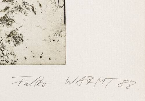 Aus: Grafikkalender 1989 (Berlin: Staatlicher Kunsthandel der DDR 1988). – Rechts unten in Bleistift signiert und datiert: ″Falko WARMT 88″. Links Auflagenbezeichnung und Titel. Trockenstempel der Grafik-Edition. – Sehr gut erhalten. Sehr guter Zustand.