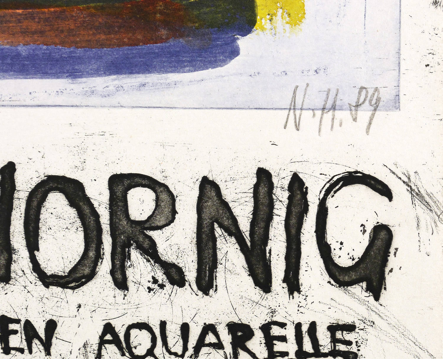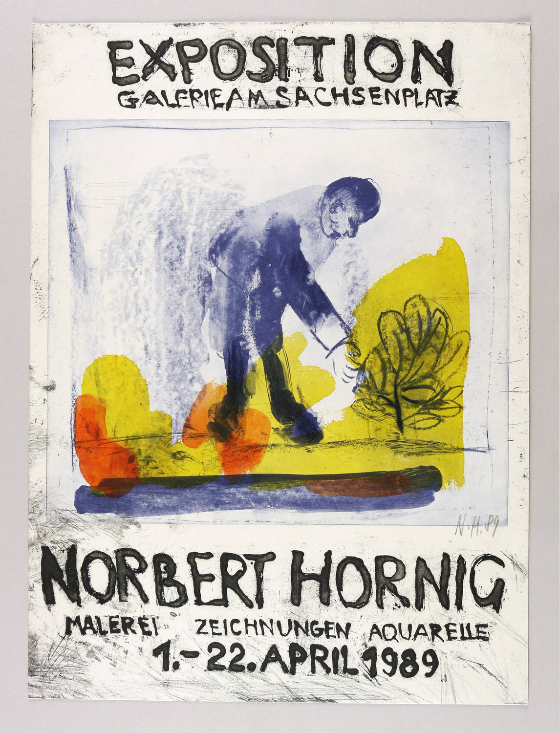 Rechts unten in Bleistift signiert und datiert: ″N.H. 89″. – Originalgrafisches Plakat zur Ausstellung ″N.H. Malerei. Zeichnungen. Aquarelle″ 1989 in der Galerie am Sachsenplatz in Leipzig. – Ecken leicht bestoßen. Insgesamt sehr guter Zustand.