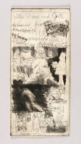 1965. Radierung / Strichätzung, Kaltnadel & Roulette, partiell geschabt, in Schwarz, mit Plattenton, auf Velin. – Originale Künstlergrafik, von Alfred Hrdlicka. – Auflage Exemplar Nr. 30/34. – 19,9 x 9,3 cm (Darstellung / Platte), 20,1 x 9,5 cm (Blatt).