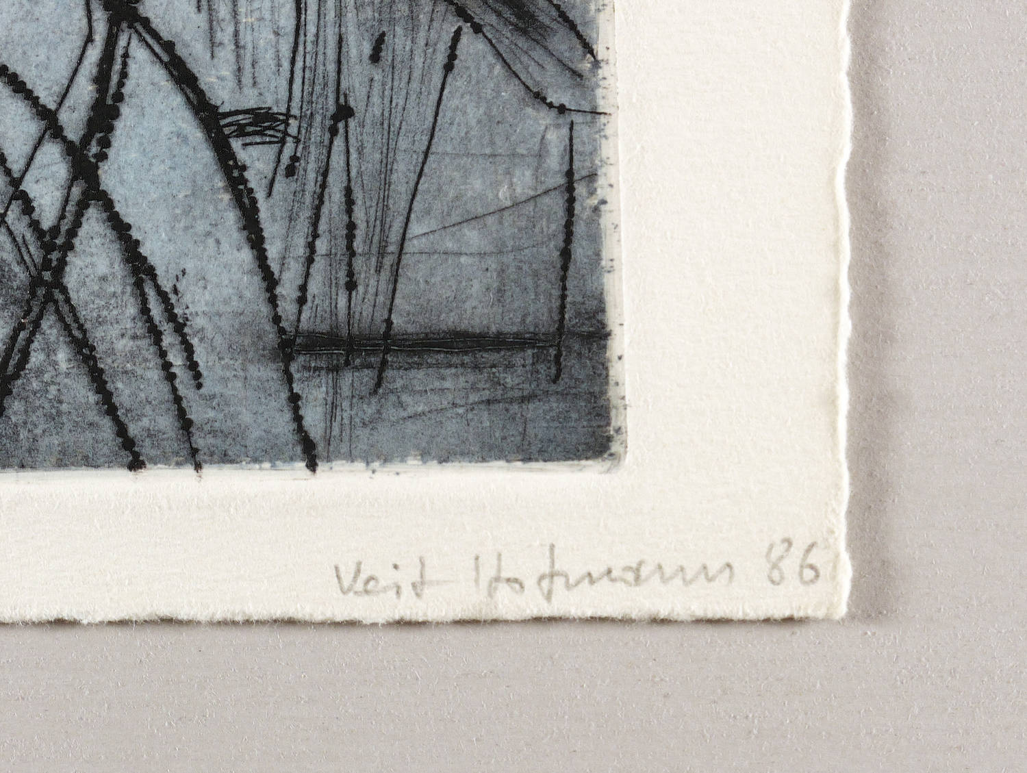1986. Farbradierung / Aquatinta & Strichätzung, in Blau & Schwarz, auf schwerem hellchamois Velin. – Originale Künstlergrafik, von Veit Hofmann. – Auflage Exemplar Nr. 4/7. – 10,4 x 11,9 cm (Darstellung / Platte), 14,7 x 10,4 cm (Blatt).