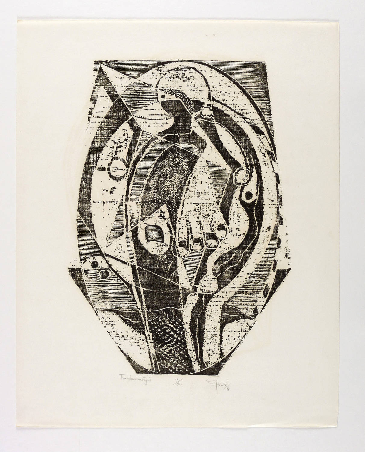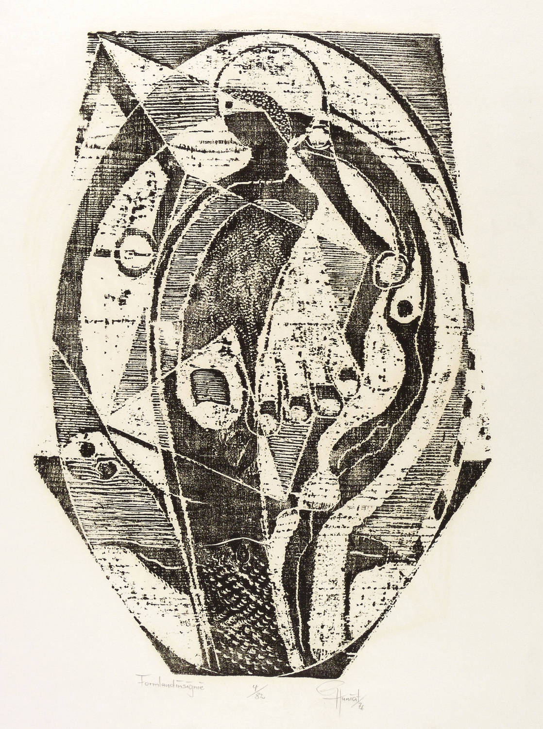 Aus: Falko Behrendt u.a., Imagination Format (Dresden: eikon Grafik-Presse 1976). – Rechts unten in Bleistift signiert und datiert: ″GHuniat 76″. Links Titel und Auflagenbezeichnung: ″Formlandinsignie 4/82″. – Leichte Druckstelle im äußersten Rand rechts unten. Sonst guter Zustand.