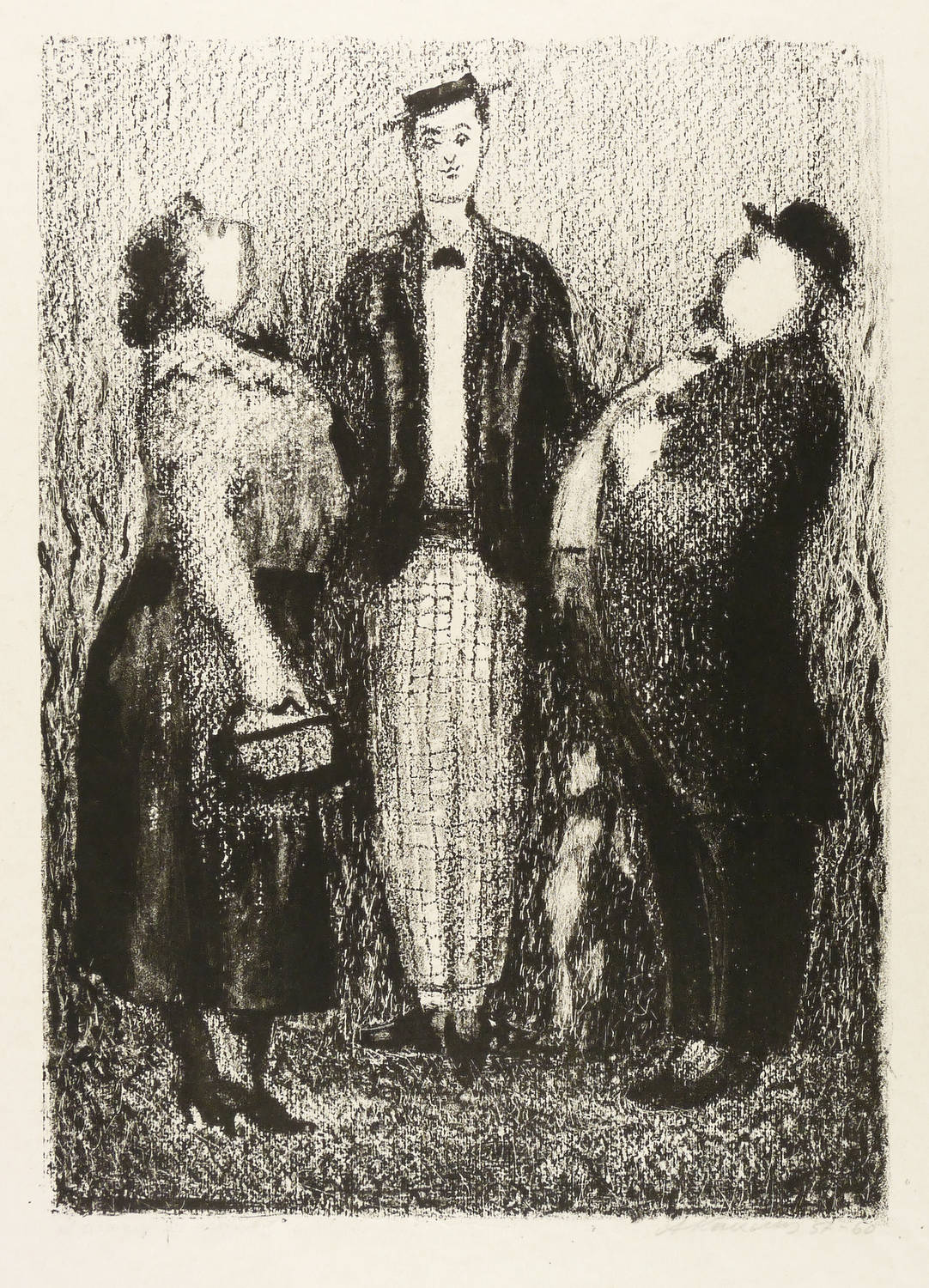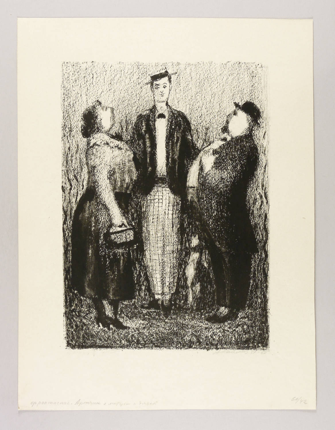 Mayer-Strodt V 66. – Rechts unten in Bleistift kyrillisch signiert und datiert: ″AKaplan 57-60″. In der linken unteren Blattecke weiter bezeichnet: ″Фронтиeниe. Арончик с мать и дядей″. Rechts gegenüber nummeriert: ″60/42″. – Signierter und autorisierter Abzug außerhalb der Auflage von 125 Exemplaren zum lithografischen Mappenwerk ″Tewje, der Milchmann″ zu Scholem Alejchem (Moskau: Sovetskij Chudoznik 1961/1966). Druck wohl in Leningrad. - Die etwas spätere Edition als illustriertes Buch (Dresden: Verlag der Kunst 1967) wurde als ″Schönstes Buch der DDR 1967″ ausgezeichnet. - Der vermögende Lebemann Arontschik umwirbt Sprinze, die vierte Tochter Tewjes, wird jedoch von Mutter und Onkel von der nicht standesgemäßen Verbindung abgehalten, was zum Freitot der Sprinze führt. - Seltenes Blatt. – Sehr guter Zustand.