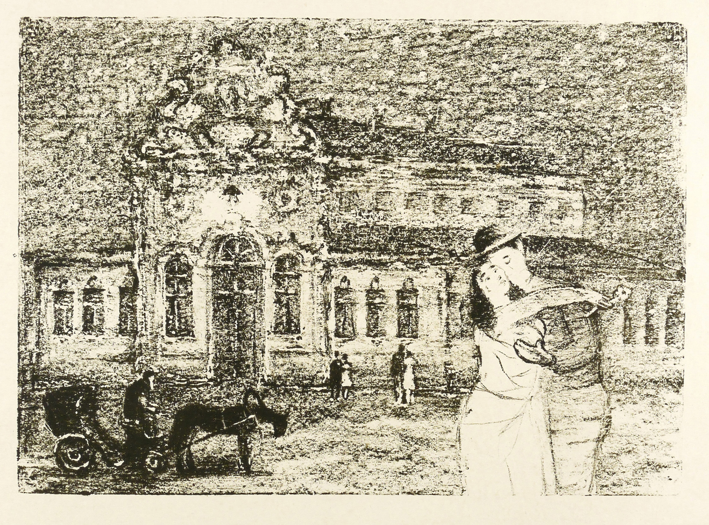 Mayer-Strodt V 129. – Nicht handsigniert. In der linken unteren Blattecke vom Künstler kyrillisch bezeichnet: ″[Егунец?]″. Rechts weiter nummeriert: ″76″. – Abzug außerhalb der Auflage von 125 Exemplaren zum lithografischen Mappenwerk ″Tewje, der Milchmann″ zu Scholem Alejchem (Moskau: Sovetskij Chudoznik 1961/1966). Druck wohl in Leningrad. - Die etwas spätere Edition als illustriertes Buch (Dresden: Verlag der Kunst 1967) wurde als ″Schönstes Buch der DDR 1967″ ausgezeichnet. - Tewjes älteste Tochter Hodel verabschiedet ihren Verlobten Pertschik am Bahnhof. - Selten. – Leichte Lagerspuren. Sonst sehr guter Zustand.