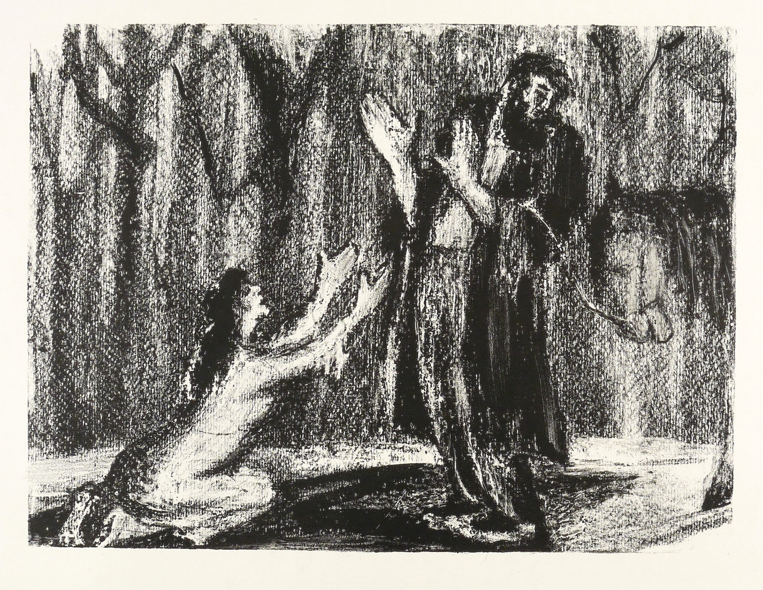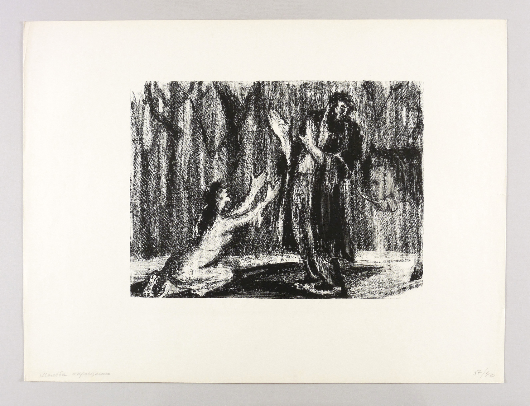 Mayer-Strodt V 94. – Nicht handsigniert. In der linken unteren Blattecke kyrillisch bezeichnet: ″ [Мольда опрощениa?]″. Rechts nummeriert: ″57/40″. – Abzug außerhalb der Auflage von 125 Exemplaren zum lithografischen Mappenwerk ″Tewje, der Milchmann″ zu Scholem Alejchem (Moskau: Sovetskij Chudoznik 1961/1966). Druck wohl in Leningrad. - Die etwas spätere Edition als illustriertes Buch (Dresden: Verlag der Kunst 1967) wurde als ″Schönstes Buch der DDR 1967″ ausgezeichnet. - Selten. – Im breiten Rand rechts kleiner Randriss. Mäßig guter Zustand.