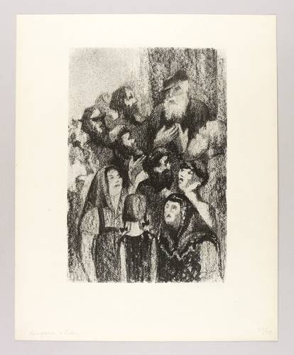 Mayer-Strodt V 90. – Nicht handsigniert. In der linken unteren Blattecke kyrillisch bezeichnet: ″Крестьяне у Тевье″. Rechts nummeriert: ″85/58″. – Abzug außerhalb der Auflage von 125 Exemplaren zum lithografischen Mappenwerk ″Tewje, der Milchmann″ zu Scholem Alejchem (Moskau: Sovetskij Chudoznik 1961/1966). Druck wohl in Leningrad. - Die etwas spätere Edition als illustriertes Buch (Dresden: Verlag der Kunst 1967) wurde als ″Schönstes Buch der DDR 1967″ ausgezeichnet. - Ein Mob sammelt sich vor dem Haus des Tewje und drohen ihm Gewalt und Vertreibung an. – Sehr guter Zustand.