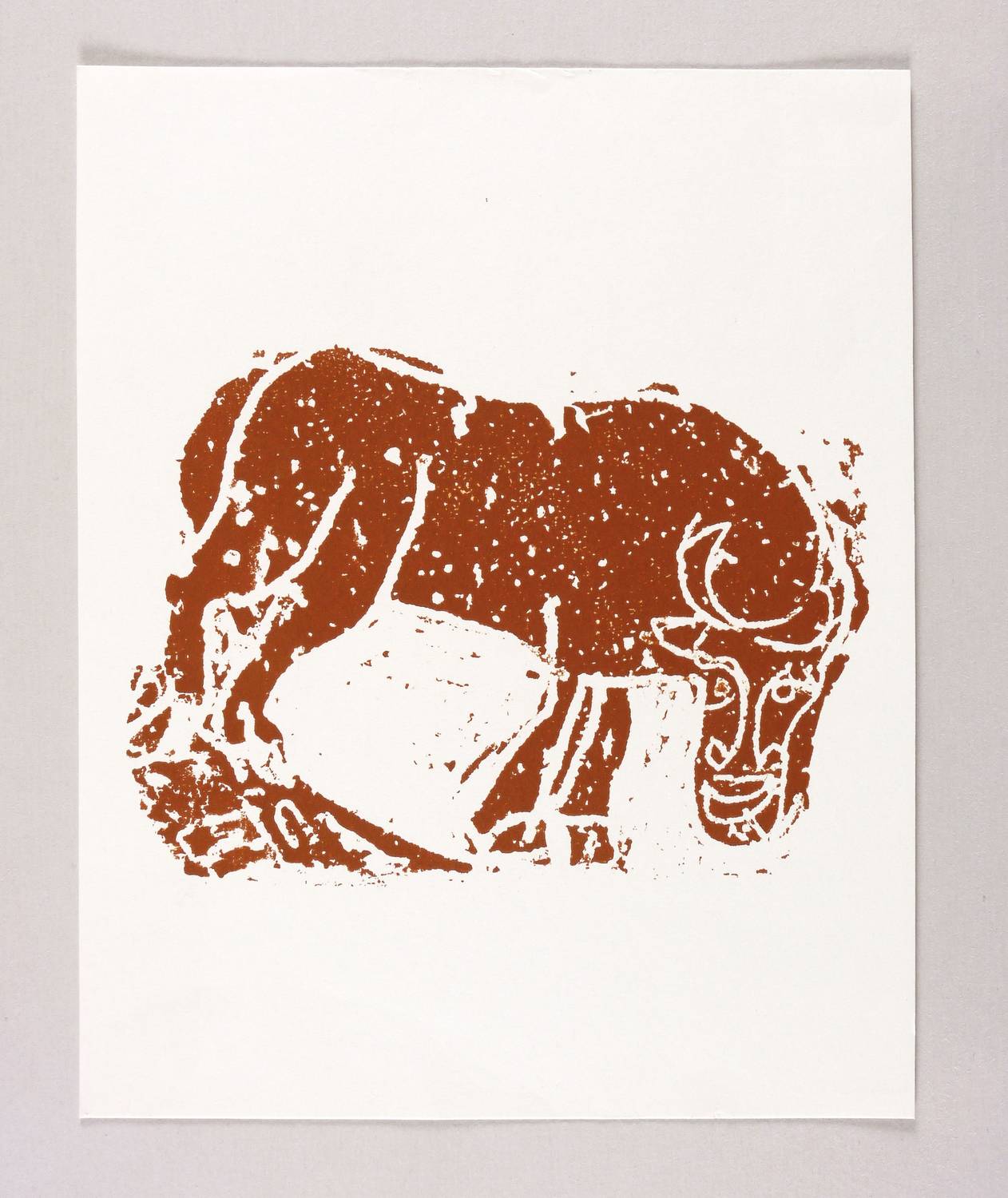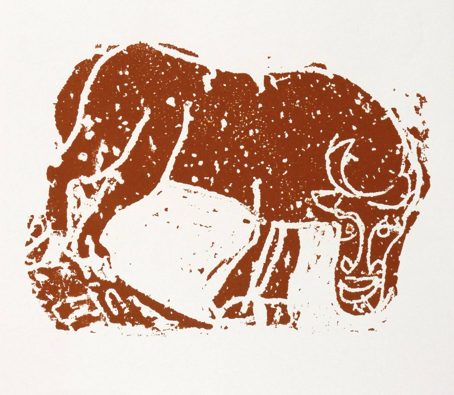 1973. Holzschnitt, in Hellbraun, auf festem hellgelbem Velin. – Originale Künstlergrafik, von HAP Grieshaber. – 13,5 x 18,4 cm (Darstellung / Druckbild), 26 x 21 cm (Blatt).