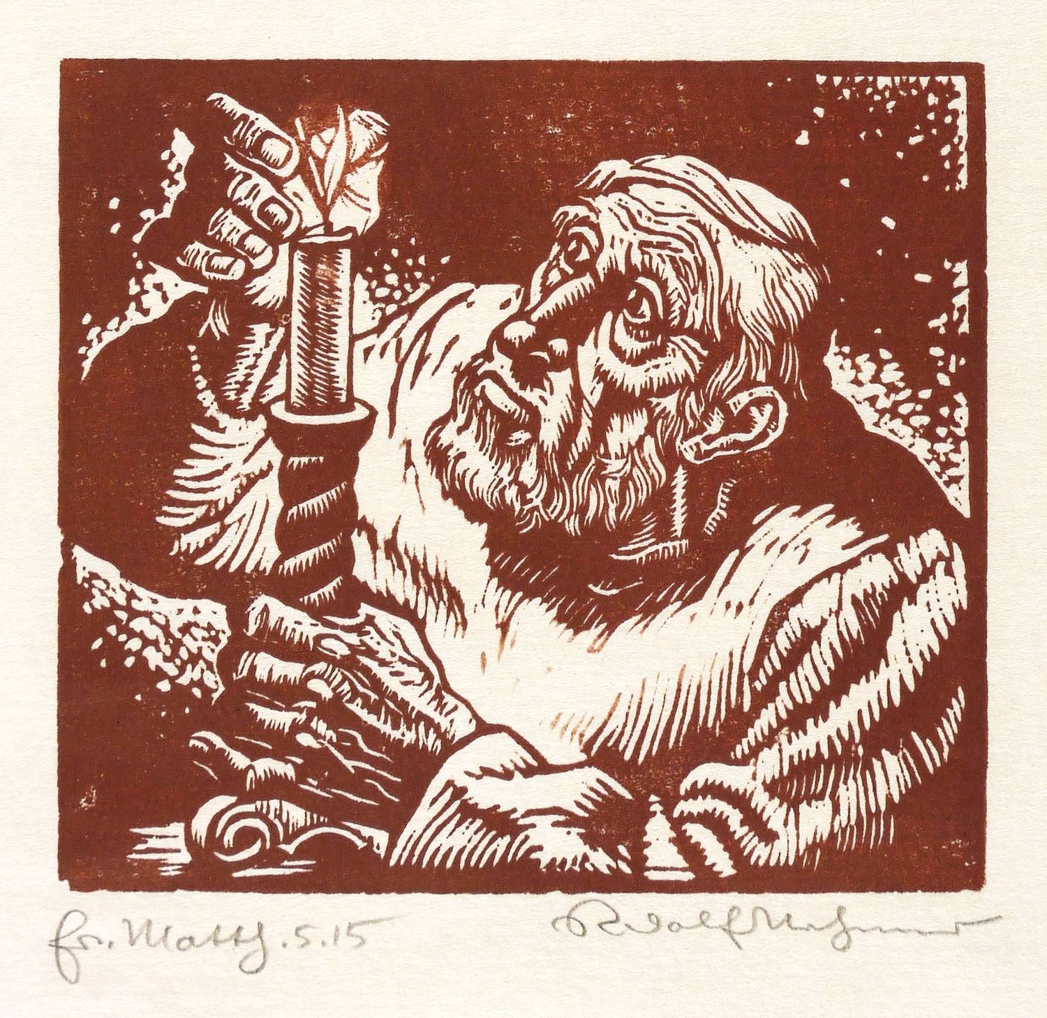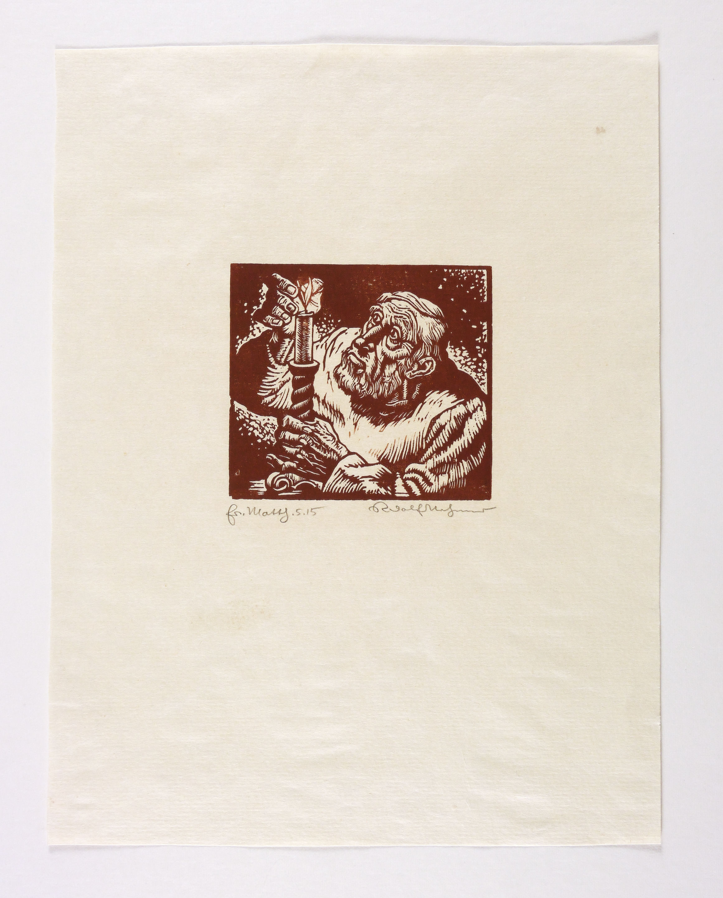 Rechts unten in Bleistift signiert: ″Rudolf Nehmer″. Links bezeichnet: ″Matth. 5.15″. – Blatt aus der bekannten Holzschnitt-Folge ″Die Bergpredigt″ zu Matthäus 5 15: ″Man zündet auch nicht ein Licht an und setzt es unter einen Scheffel, sondern auf einen Leuchter. So leuchtet es allen, die im Hause sind.″ – Papier minimal gewellt. Guter Zustand.