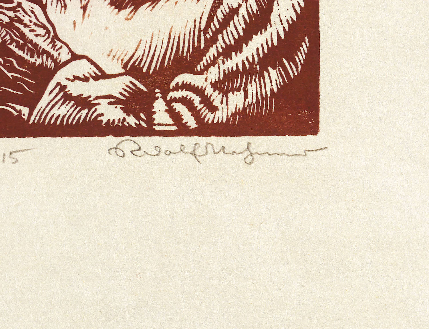 1948. Holzschnitt, in Rotbraun, auf wolkigem gelbem Velin. – Originale Künstlergrafik, von Rudolf Nehmer. – 9,8 x 10,8 cm (Darstellung / Druckstock), 33 x 25 cm (Blatt).