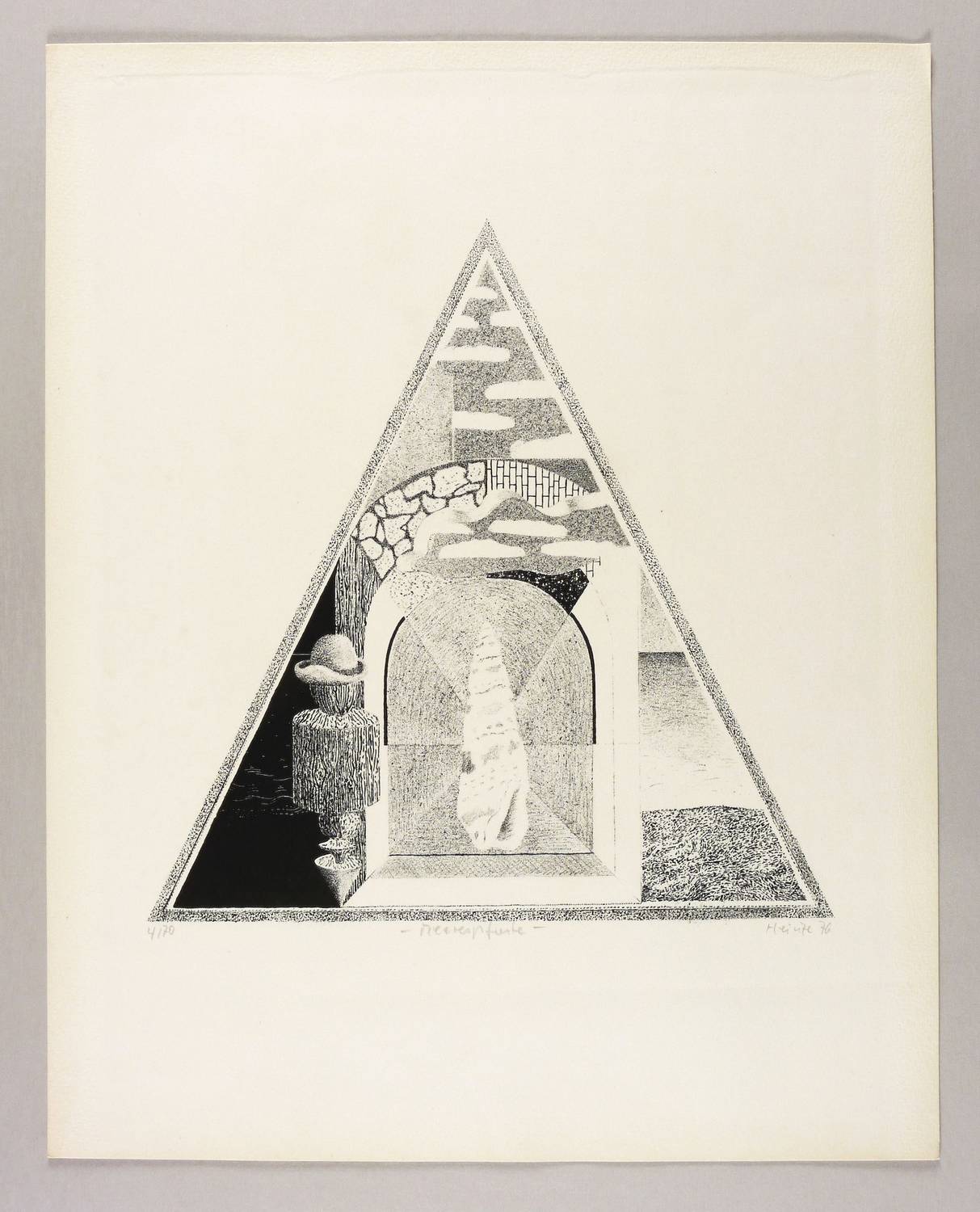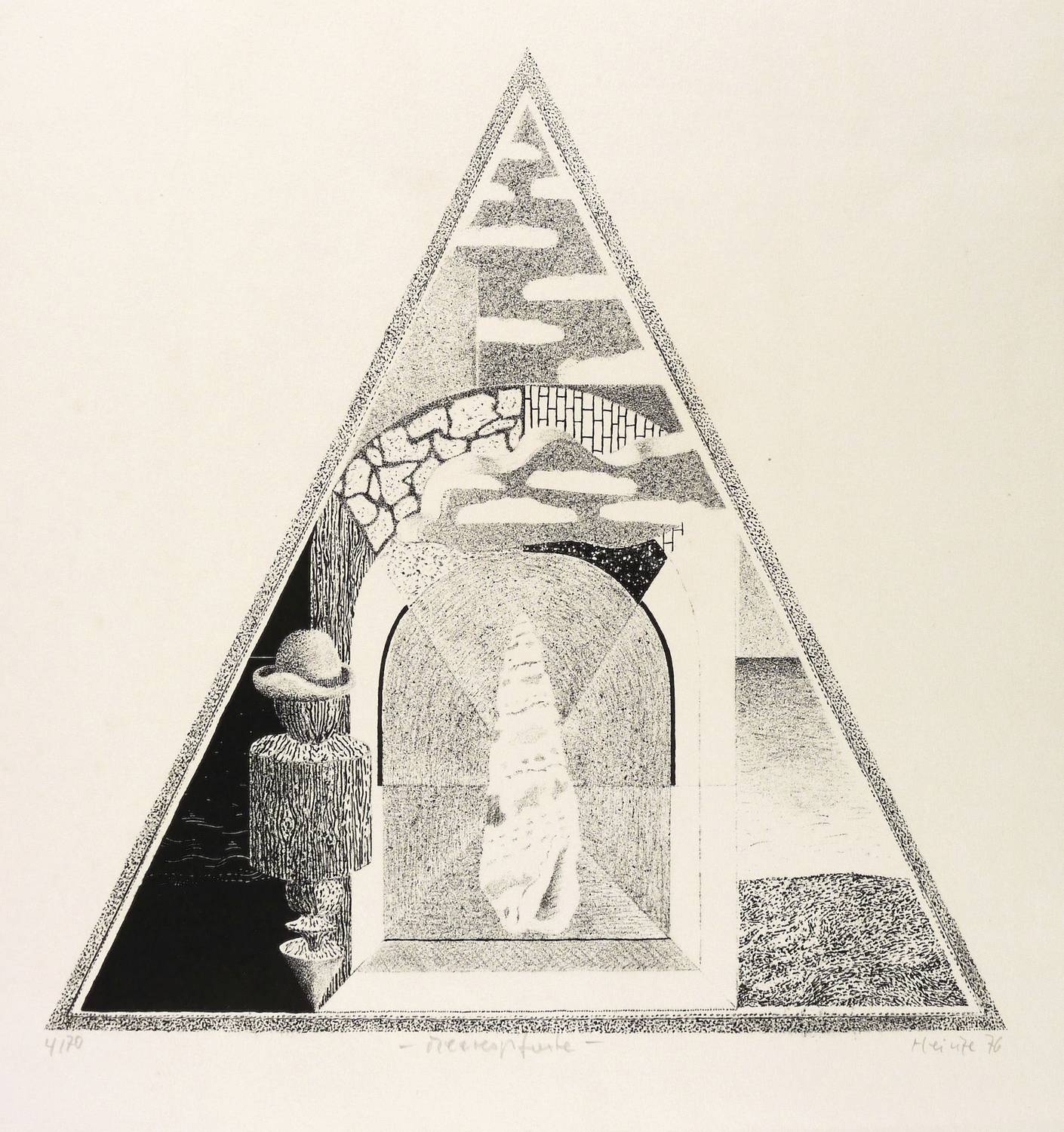 1976. Lithografie / Kreide-, Feder- & Pinsellithografie, in Schwarz, auf leichtem hellgelbem Velinkarton. – Originale Künstlergrafik, von Frieder Heinze. – Auflage Exemplar Nr. 4/70. – 30,7 x 30,1 cm (Darstellung / Druckbild), 49 x 39 cm (Blatt).
