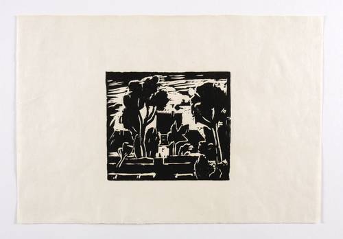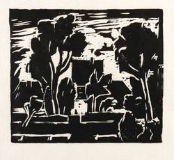1945-1955. Holzschnitt, in Schwarz, auf wolkigem hellchamois Simili-Japan. – Originale Künstlergrafik, von Ruth Meier. – 13,1 x 14,9 cm (Darstellung / Druckstock), 25 x 37 cm (Blatt).