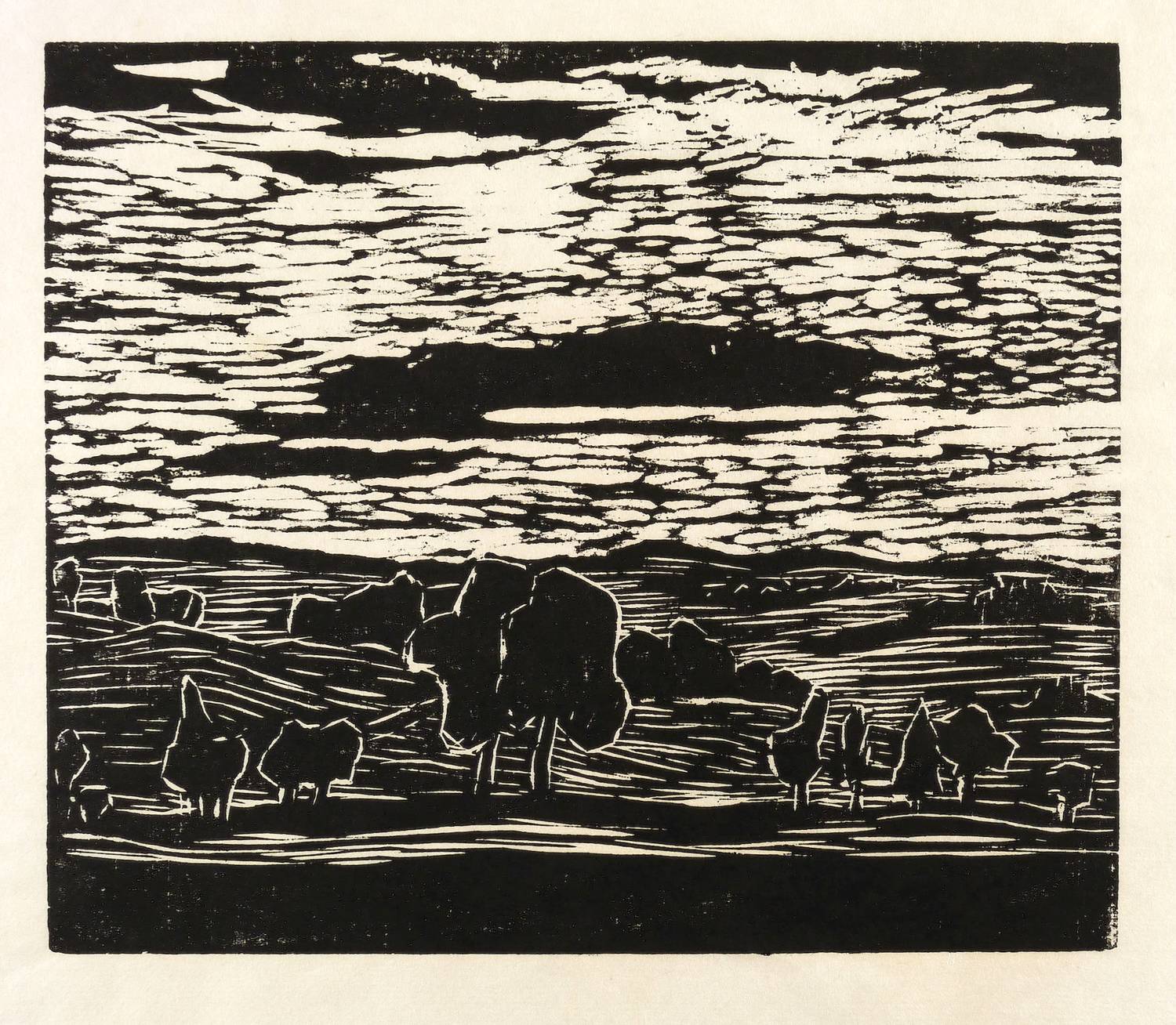 Um 1930. Holzschnitt, in Schwarz, auf wolkigem hellchamois Simili-Japan. – Originale Künstlergrafik, von Ruth Meier. – 23,8 x 28,0 cm (Darstellung / Druckstock), 36 x 49 cm (Blatt).