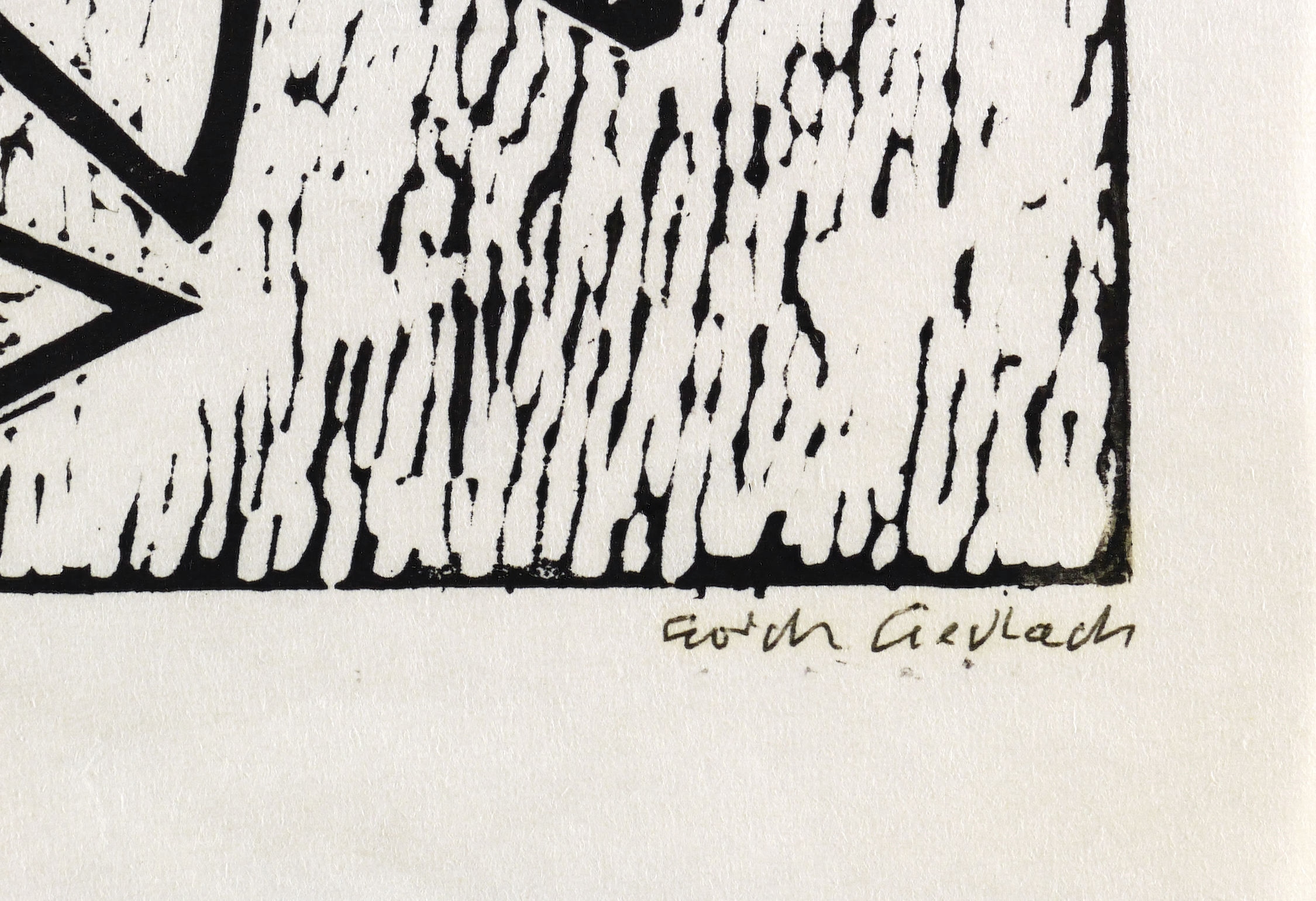 1989. Linolschnitt, in Schwarz, auf halbtransparentem weißem Papier. – Originale Künstlergrafik, von Erich Gerlach. – 26,1 x 16,9 cm (Darstellung), 30 x 20 cm (Blatt).