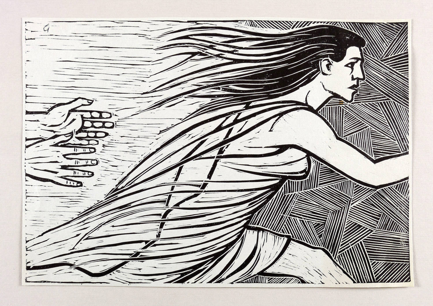 1987. Linolschnitt, in Schwarz, auf glattem hellgrauem Tonpapier. – Originale Künstlergrafik, von Erich Gerlach. – 20,5 x 29,9 cm (Darstellung), 21,3 x 30,4 cm (Blatt).