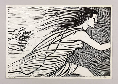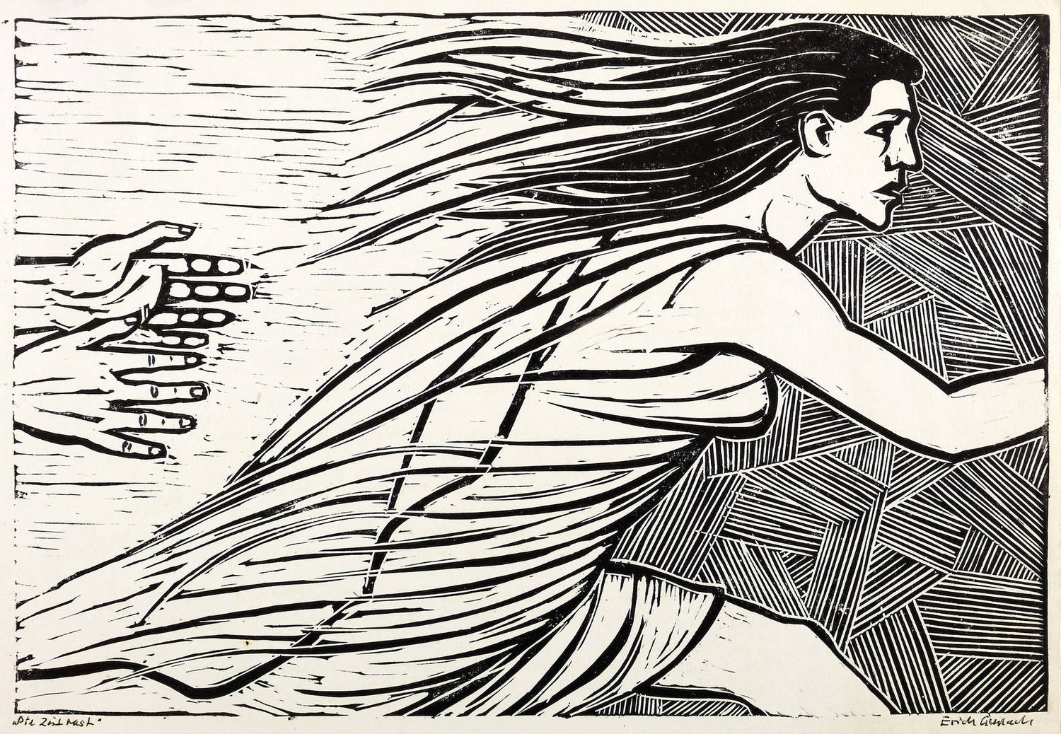 1987. Linolschnitt, in Schwarz, auf hellchamois Maschinenpapier. – Originale Künstlergrafik, von Erich Gerlach. – 20,7 x 30,2 cm (Darstellung / Druckbild), 21,8 x 31,2 cm (Blatt).