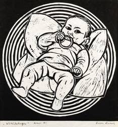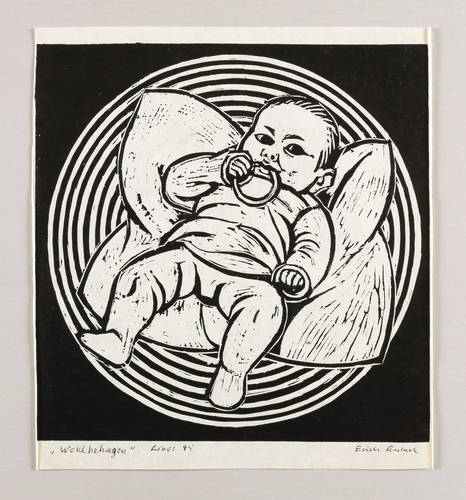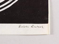 Rechts unten in Kugelschreiber signiert: ″Erich Gerlach″. Links bezeichnet mit Titel, Jahr und Technikbezeichnung: ″Wohlbehagen // Linol 85″. – Sehr guter Zustand.
