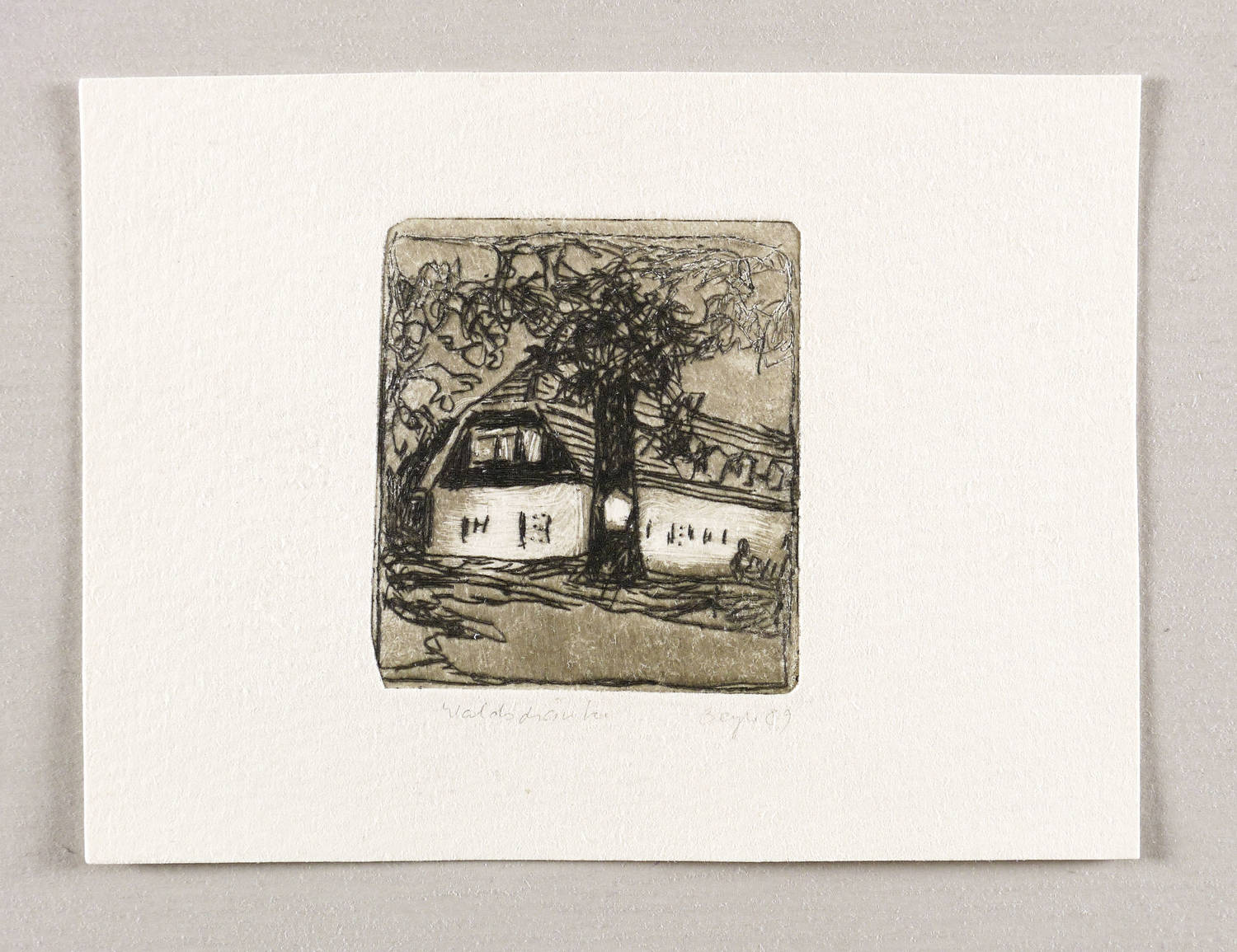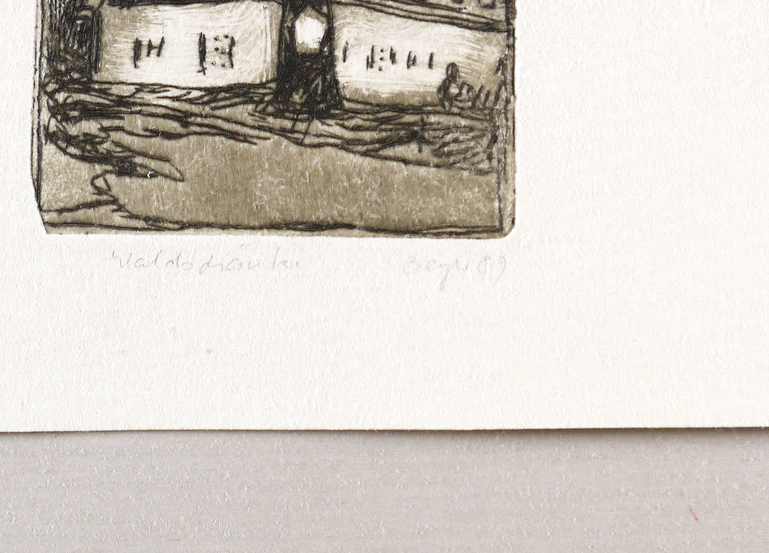 1989. Farbradierung / Strichätzung, in Hellgrau & Schwarz, auf hellem Velinkarton. – Originale Künstlergrafik, von Manfred Beyer. – 5,4 x 4,8 cm (Darstellung / Platte), 10 x 12 cm (Blatt).
