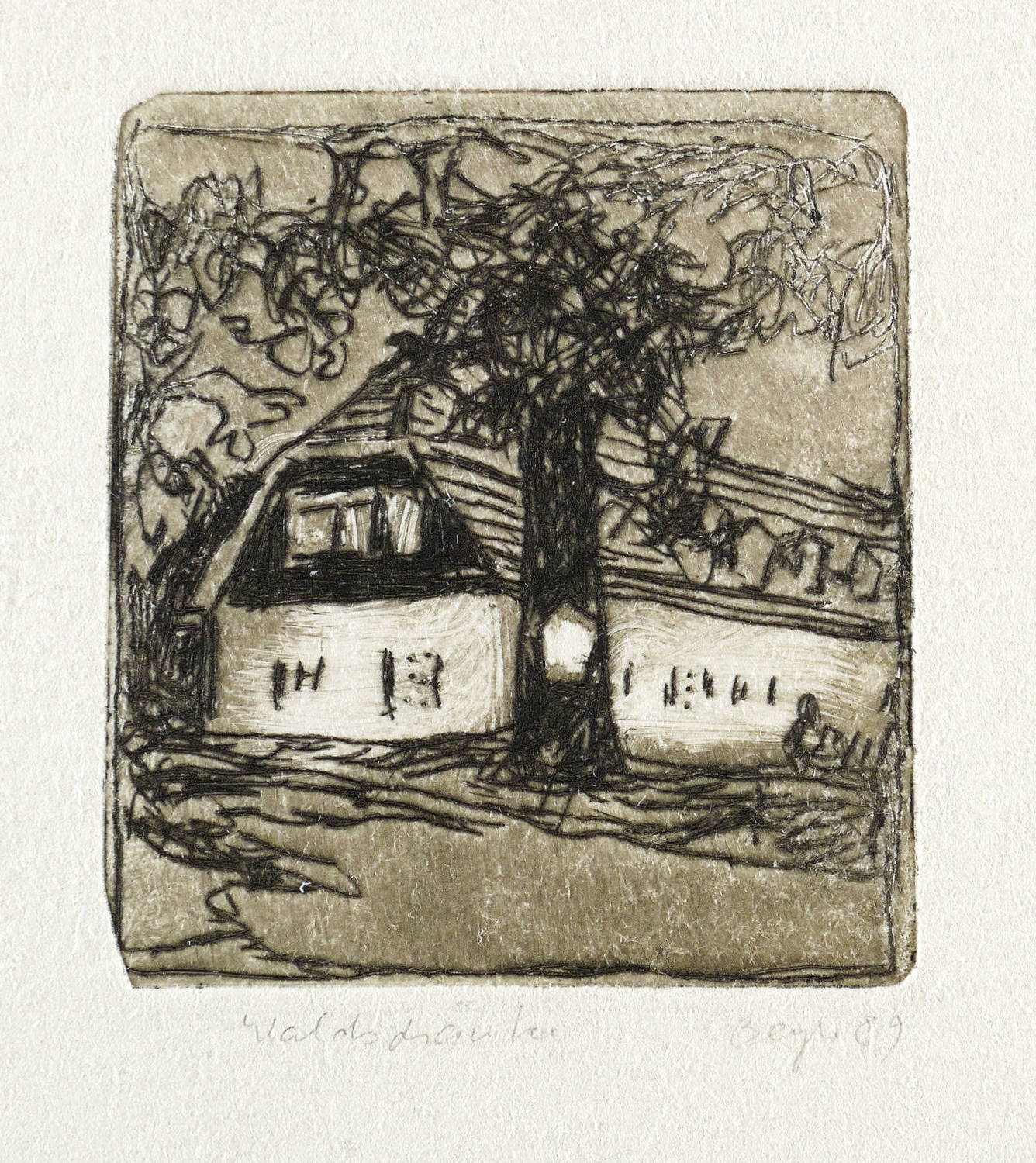 Rechts unten in Bleistift signiert und datiert: ″Beyer 89″. Links Titel: ″Waldschänke″. – Sehr gut erhalten.