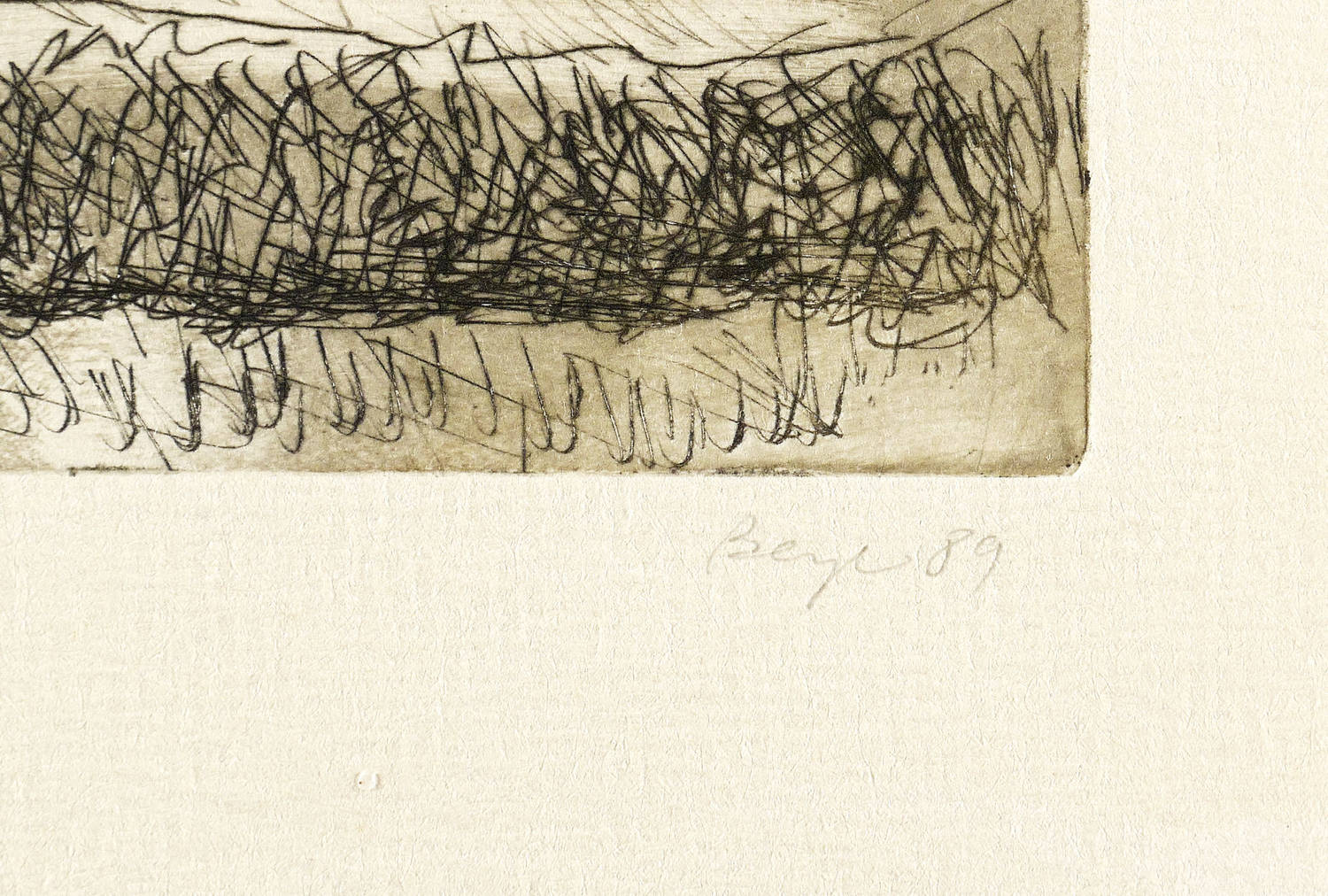 1989. Farbradierung / Strichätzung, in Schiefergrau & Schwarz, auf festem Maschinenbütten. – Originale Künstlergrafik, von Manfred Beyer. – 11,8 x 18,9 cm (Darstellung / Platte), 18 x 24 cm (Blatt).