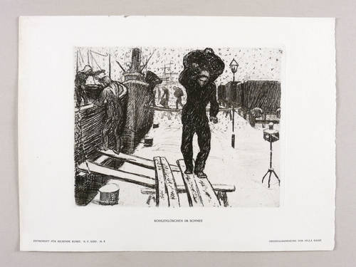 Aus: Zeitschrift für bildende Kunst (Leipzig: E.A. Seemann 1866-1932). – Nicht handsigniert. Rechts unten typografisch bezeichnet: ″ORIGINALRADIERUNG VON SELLA HASSE″. Mittig Titel: ″KOHLENLÖSCHEN IM SCHNEE″. Wasserzeichen der Papiermühle. – Tadellos. Sehr guter Erhaltungszustand.