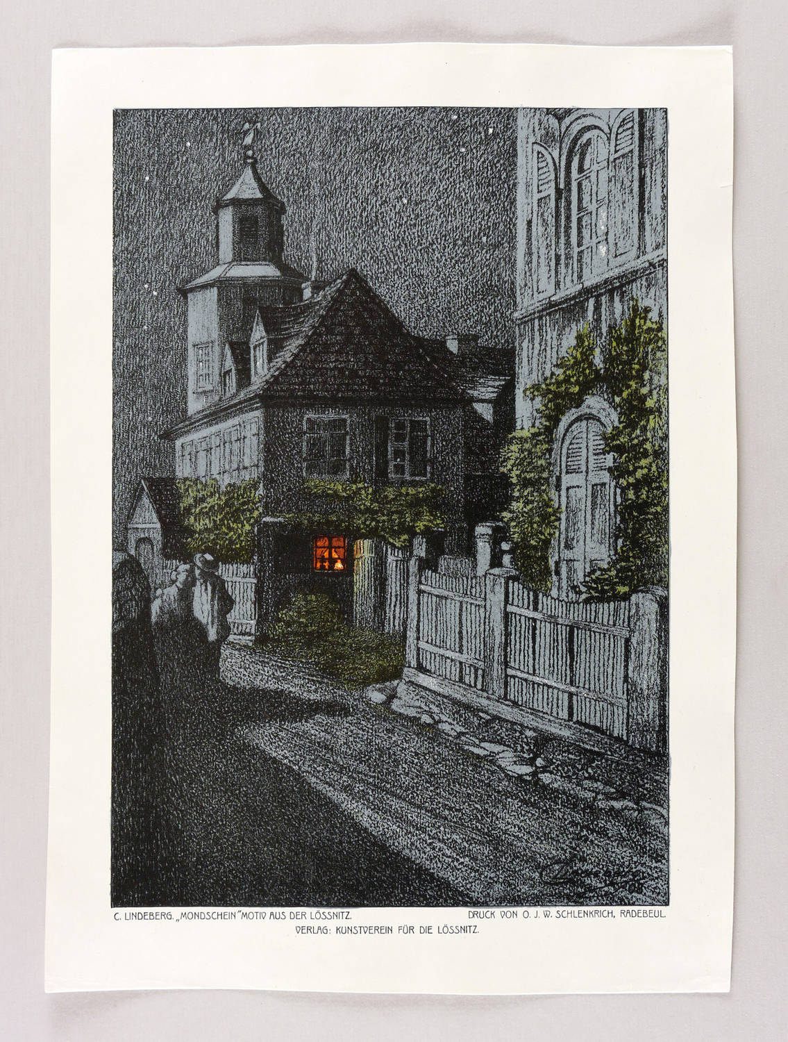 Im Stein rechts unten signiert und datiert: ″CLindeberg 08.″ Unter der Darstellung typografisch bezeichnet: ″C. LINDEBERG. 'MONDSCHEIN' MOTIV AUS DER LÖSSNITZ″. Dazu Druckeradresse: ″DRUCK VON O.J.W. SCHLENKRICH, RADEBEUL″. Weiter Verlagsadresse. – Erschienen im Verlag des Kunstverein für die Lößnitz. – Sehr gut erhalten.