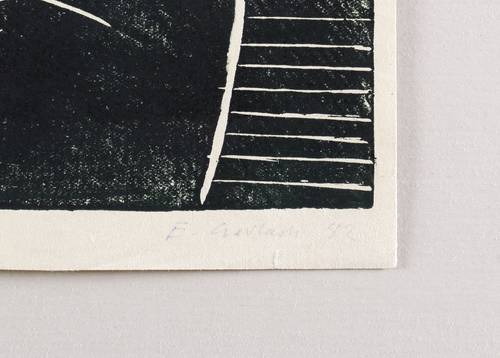 Rechts unten in grauer Feder signiert und datiert: ″E. Gerlach 82″. Links bezeichnet: ″'Innovation' Linol / Handabzug″. Verso persönliche Widmung. – Schmalrandiges Exemplar. Untere Blattecken leicht bestoßen. Mäßig gut erhalten.