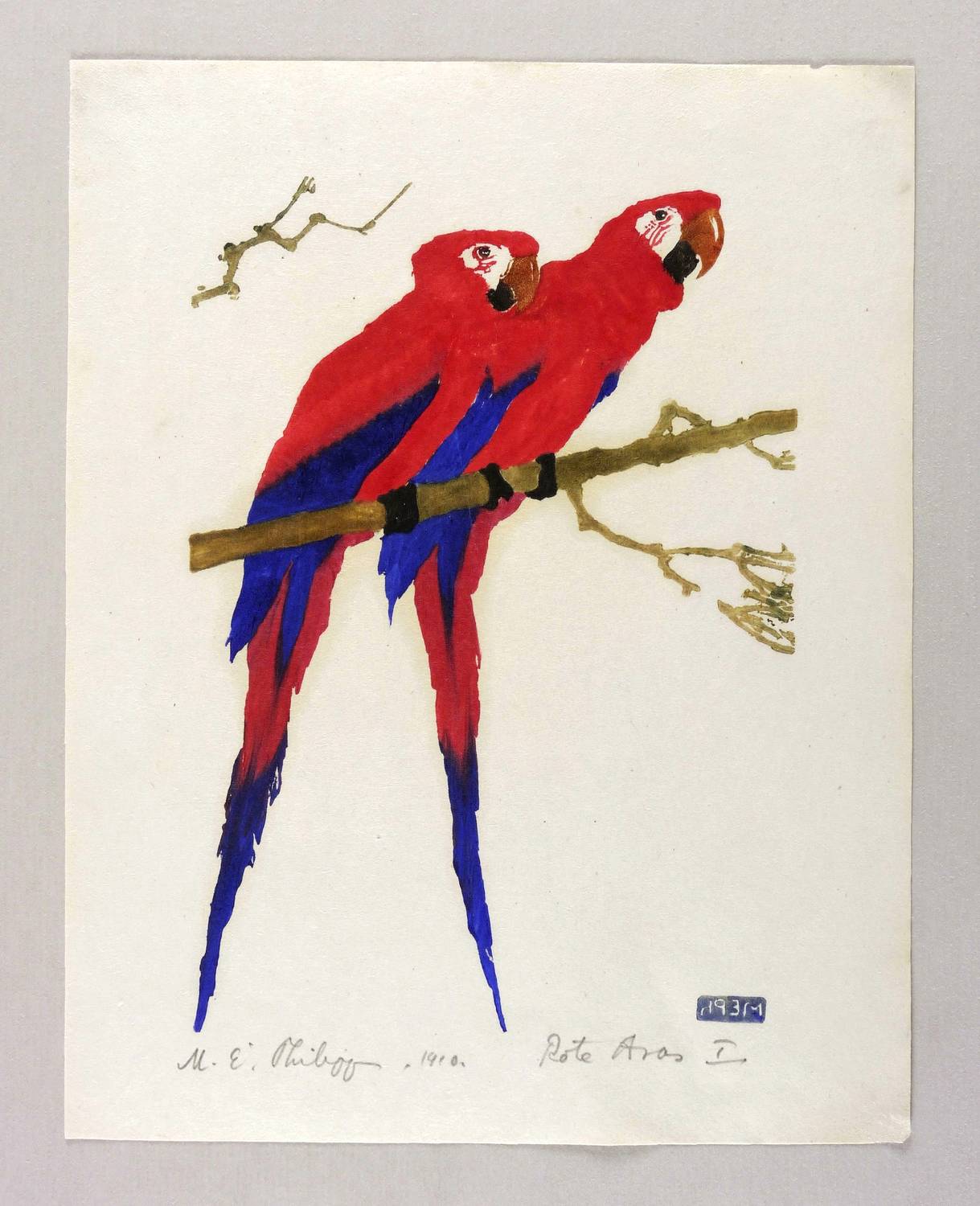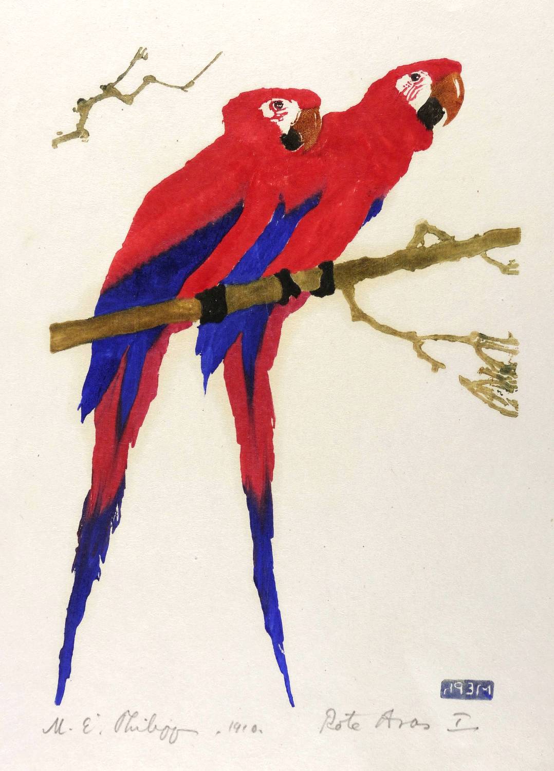 Götze D 5. – Rechts unten in Bleistift signiert und datiert: ″M.E. Philipp. 1910.″ Links Titel: ″Rote Aras I″. Im Druckstock rechts unten spiegelverkehrt Monogramm. – Etwas späterer Abzug von dem schon 1908 hergestellten Holzstock. – In den Blattecken leicht angestaubt. Sonst ohne Tadel. Sehr guter Zustand.