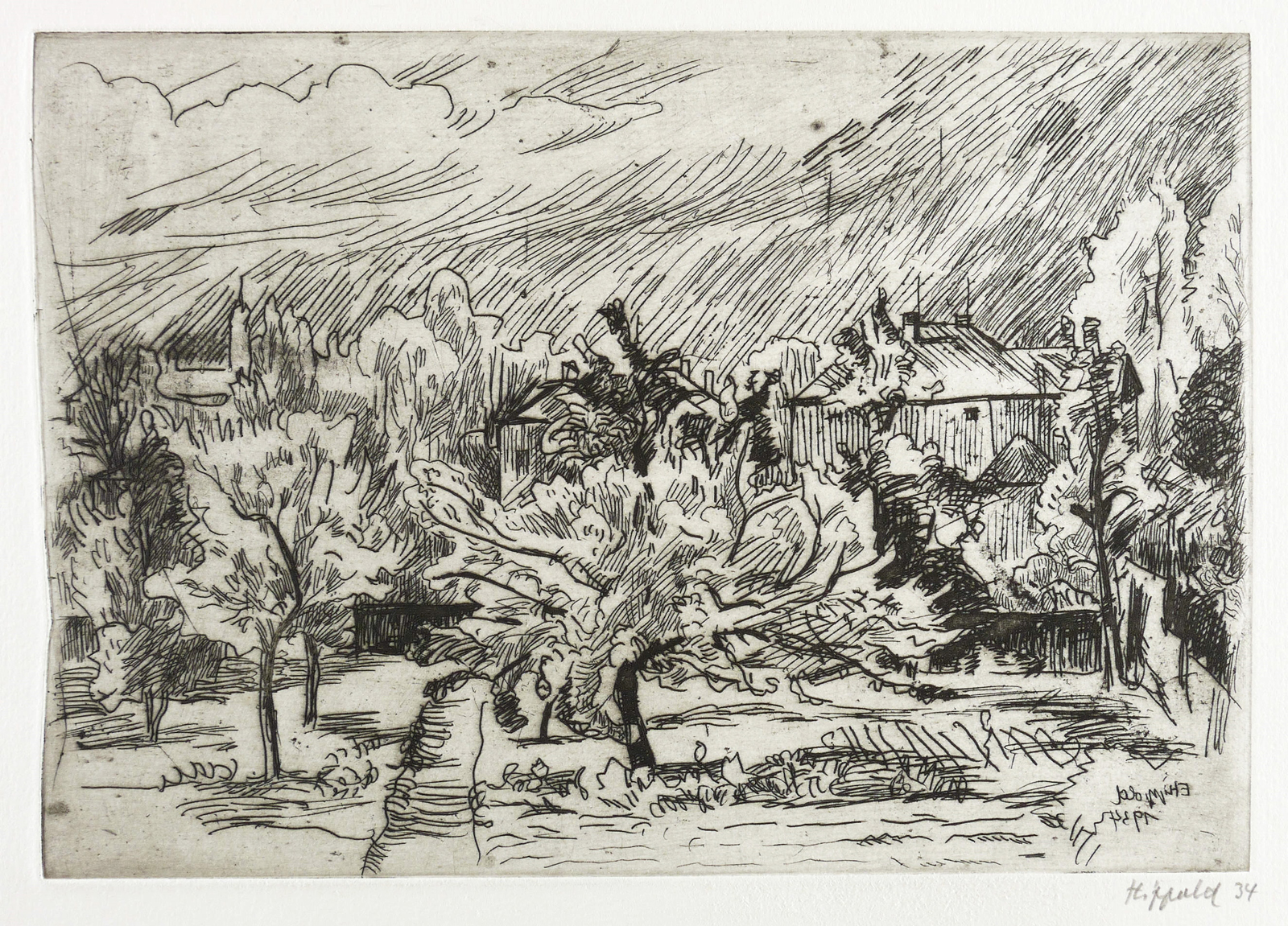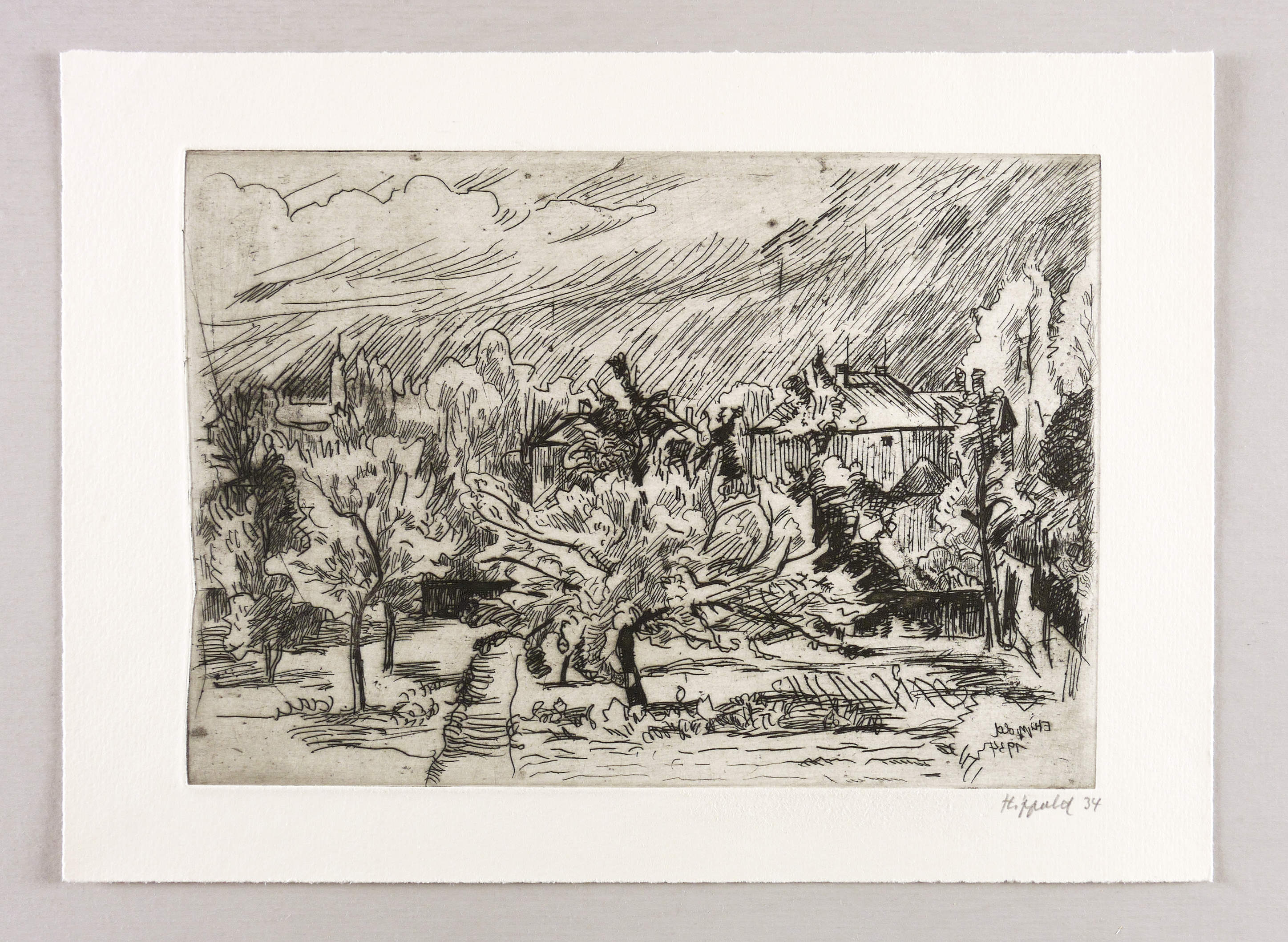 1934. Radierung / Kaltnadel, mit Plattenton, in Schwarz, auf Kupferdruckkarton. – Originale Künstlergrafik, von Erhard Hippold. – 18,5 x 26,4 cm (Darstellung / Platte), 24 x 34 cm (Blatt).