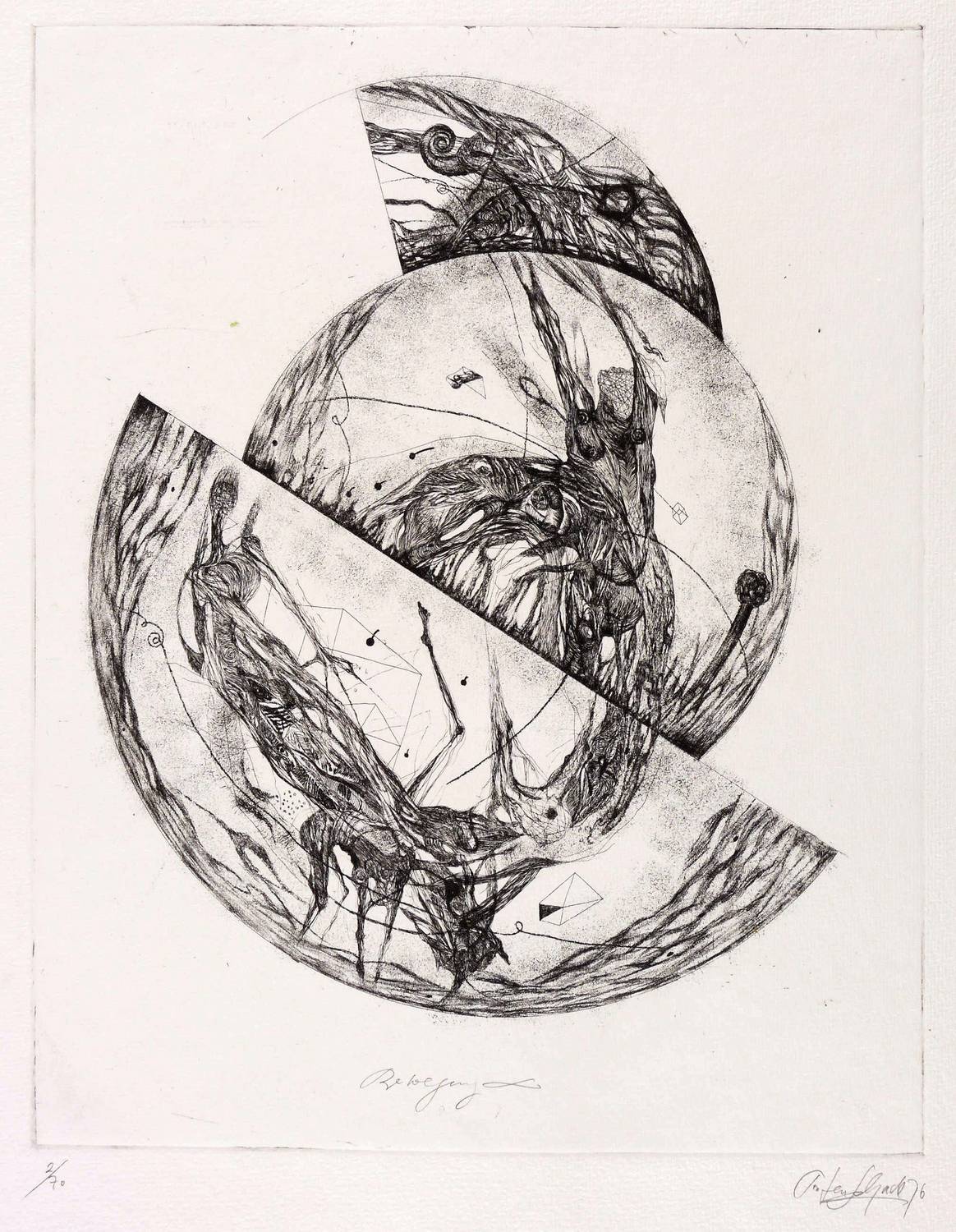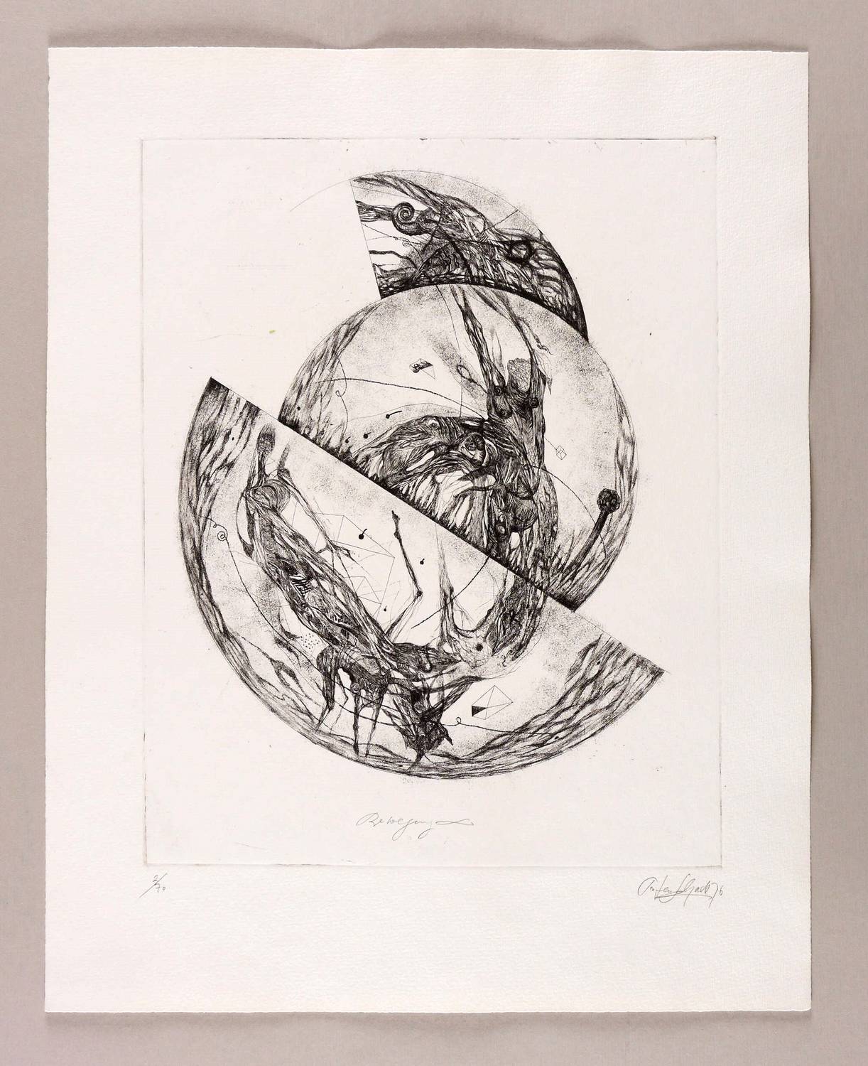 Aus: Falko Behrendt u.a., Imagination Format (Dresden: eikon Grafik-Presse 1976). – In Bleistift rechts unten signiert und datiert: ″Torsten Schade 76″. Links Titel und Auflagenbezeichnung. – Blatt Nr. 8 aus der Mappe ″Imagination Format″ der eikon Grafik-Presse in Dresden. – Sehr guter Zustand.