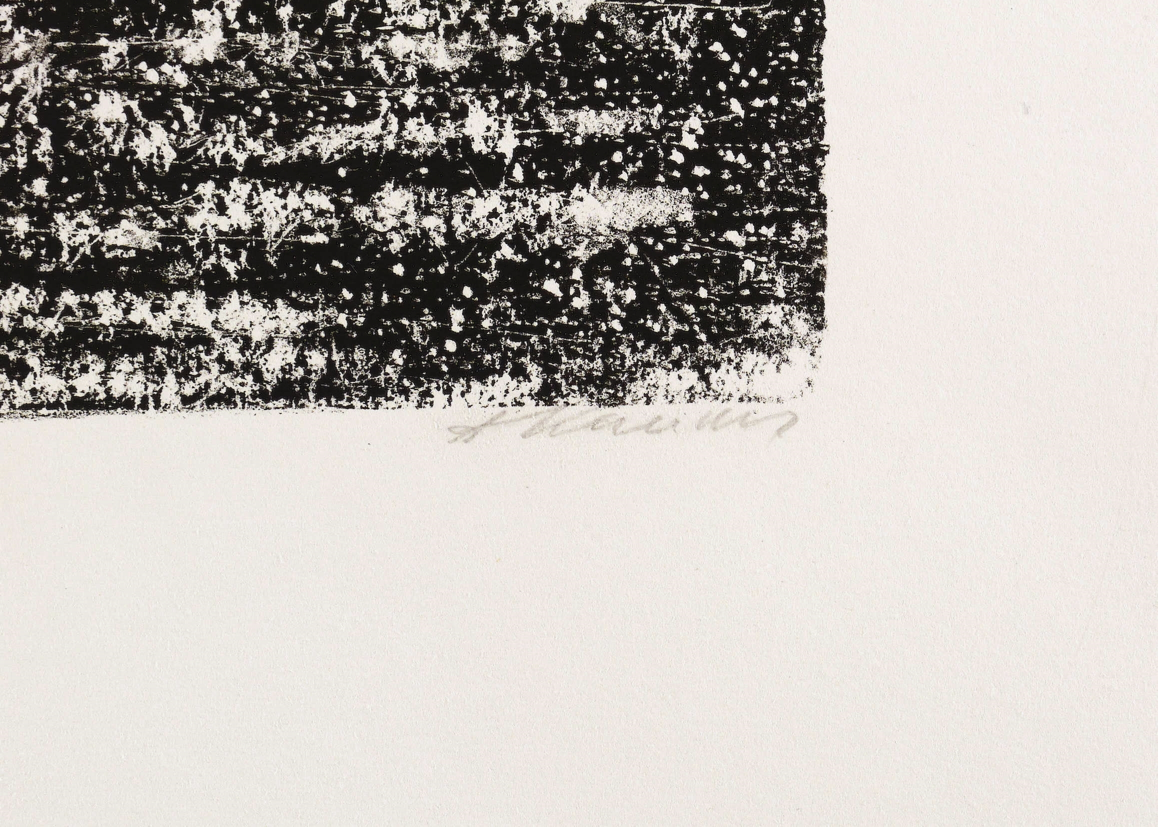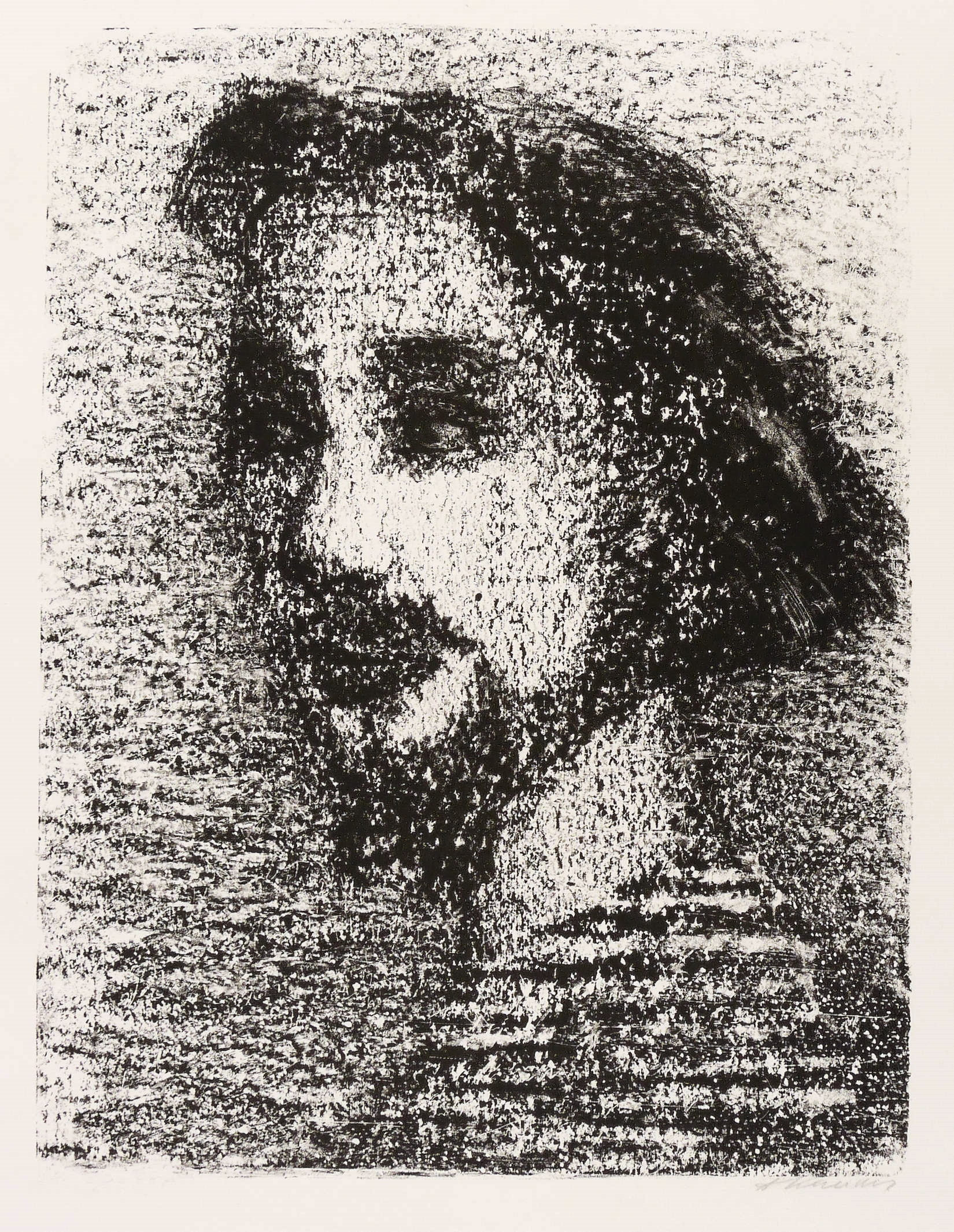1957-1960. Lithografie / Kreide- & Pinsellithografie, partiell gespritzt & geschabt, in Schwarz, auf Werkdruckpapier. – Originale Künstlergrafik, von Anatoli Kaplan. – 41,0 x 30,9 cm (Darstellung / Druckbild), 62 x 47 cm (Blatt).