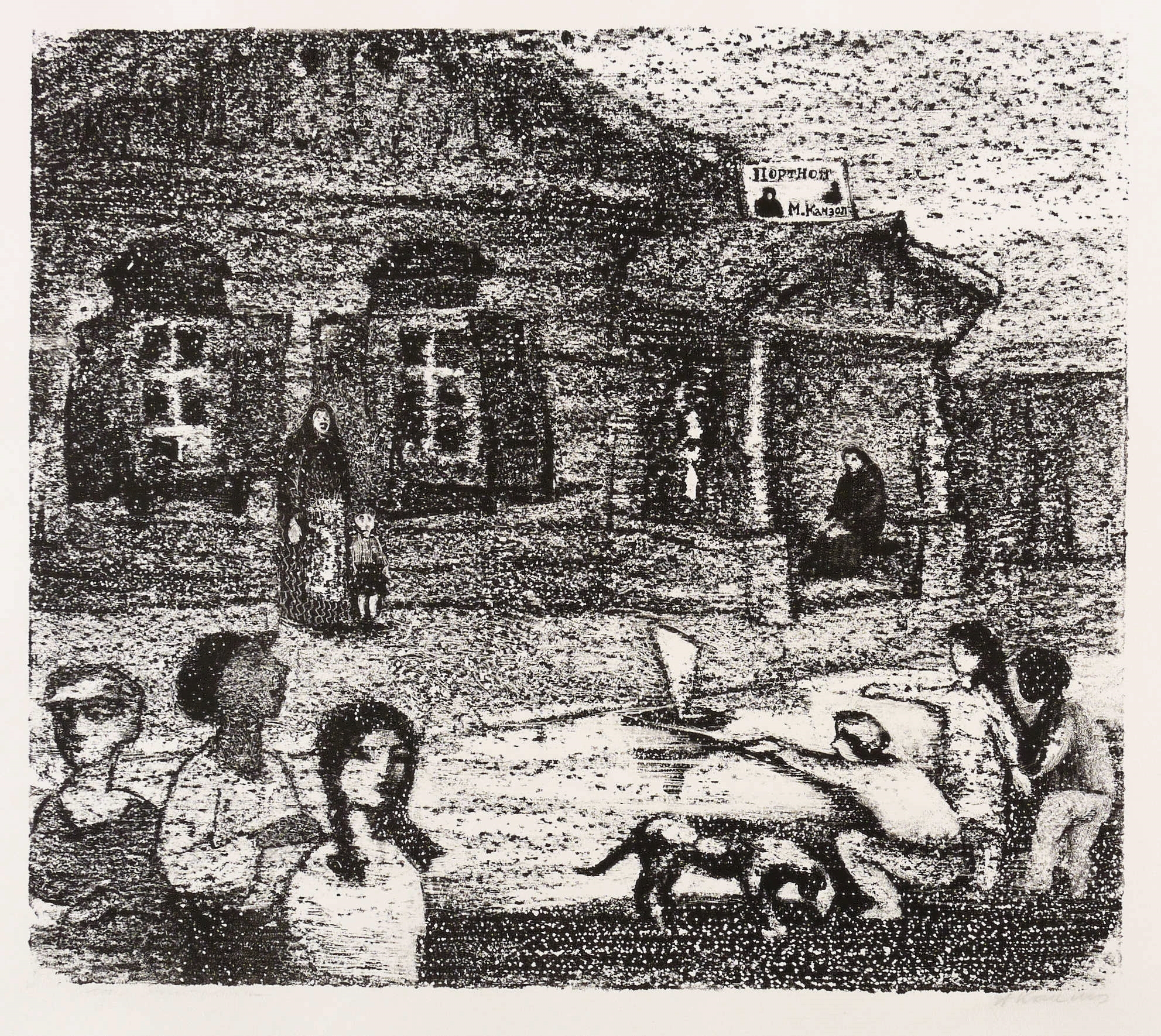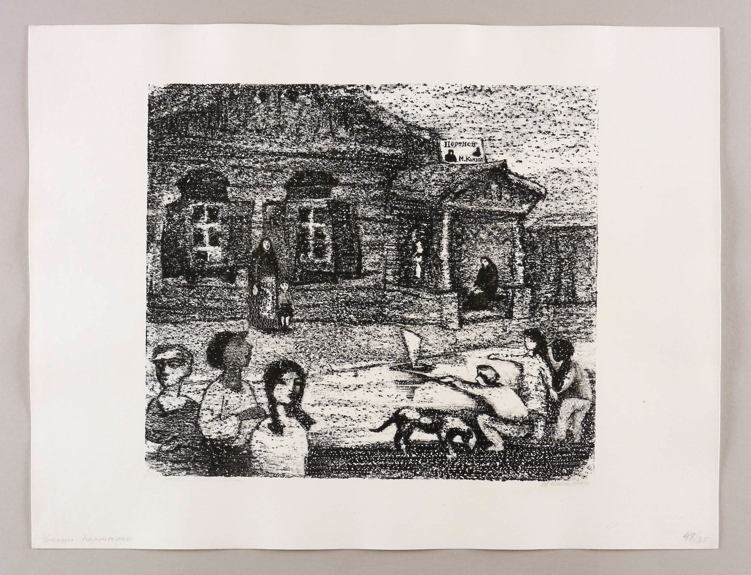 Mayer-Strodt V 54. – Rechts unten in Bleistift kyrillisch signiert: ″АКаплан″. Im unteren Blattrand Titel und Nr.: ″Дети портного // 48/35″. – Autorisierter Abzug außerhalb der Auflage von 125 Exemplaren zum lithografischen Mappenwerk ″Tewje, der Milchmann″ zu Scholem Alejchem (Moskau: Sovetskij Chudoznik 1961/1966). Druck wohl in Leningrad. - Die etwas spätere Edition als illustriertes Buch (Dresden: Verlag der Kunst 1967) wurde als ″Schönstes Buch der DDR 1967″ ausgezeichnet. - Spielende Kinder vor dem Haus des Schneiders Motel Kamisol (Mottel Kamzoil), der um die Hand von Zeitel, der ältesten Tochter von Tewje, anhält. - Seltenes Blatt! – Unbeschnittenes breitrandiges Exemplar. Tadellos. Sehr gut erhalten.