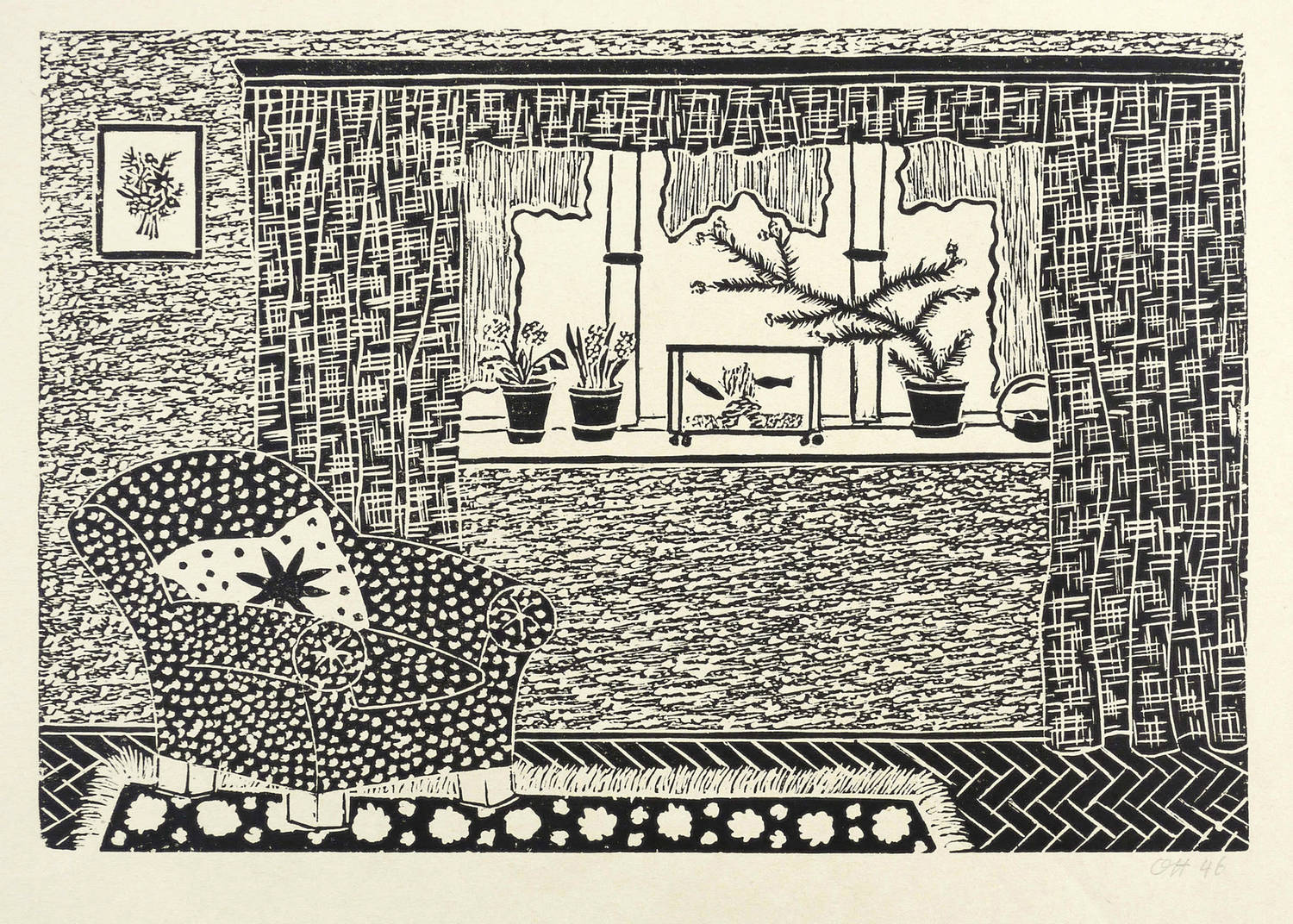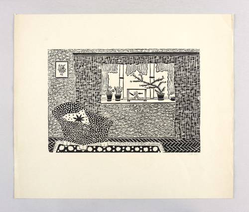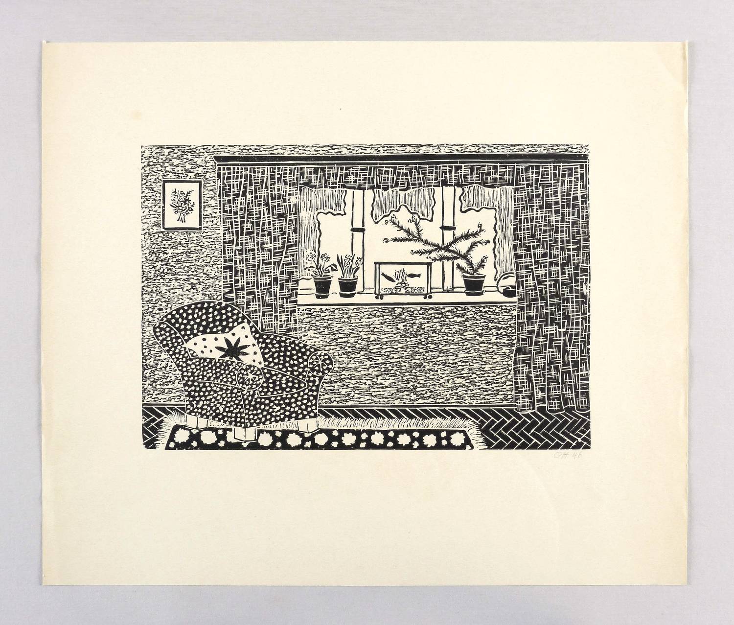 Rechts unten in Bleistift signiert und datiert: ″Ott 46″. – Aus einer Mappe ″12 Linolschnitte″ der Graphikklasse von Prof. Eduard Ege an der Meisterschule für Deutschlands Buchdrucker in München 1946. – Leichte Knickspuren im Rand. Mäßig guter Zustand.