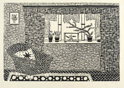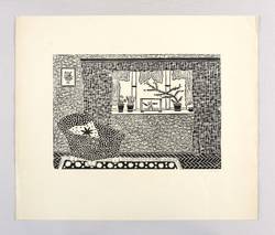 1946. Linolschnitt, in Schwarz, auf gelbem Velin. – Originale Künstlergrafik, von Franz Josef Ott. – 17,1 x 25,0 cm (Darstellung / Druckbild), 31 x 36 cm (Blatt).