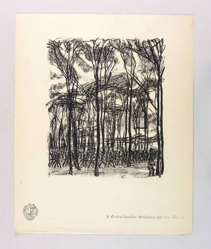 Aus: Krieg und Kunst. Original-Steinzeichnungen der Berliner Sezession (Berlin: Julius Bard 1917). – Nicht handsigniert. Am Blattrand rechts unten typografisch bezeichnet ″F. Giebelhausen: Soldaten auf dem Marsch″. Links unten Vignette der Berliner Secession. – Papier etwas gegilbt. Leichte Knickspuren. Kleiner Randriss rechts oben hinterlegt. Mäßig guter Zustand.