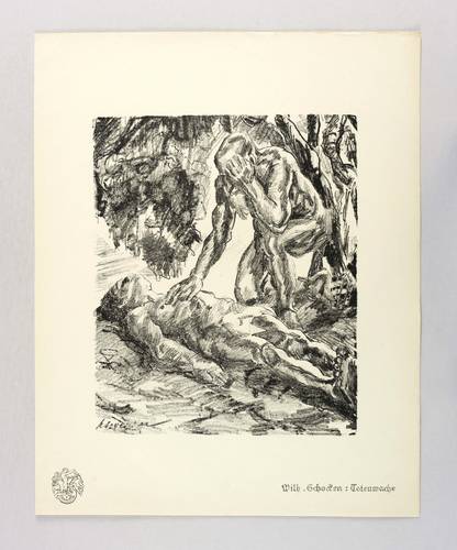 Aus: Krieg und Kunst. Original-Steinzeichnungen der Berliner Sezession (Berlin: Julius Bard 1915). – Nicht handsigniert. Im Stein links unten signiert: ″Schocken″. Am Blattrand rechts unten typografisch bezeichnet ″Wilh. Schocken: Totenwache″. Links unten Vignette der Berliner Secession. – Papier leicht gegilbt. Sehr guter Zustand.