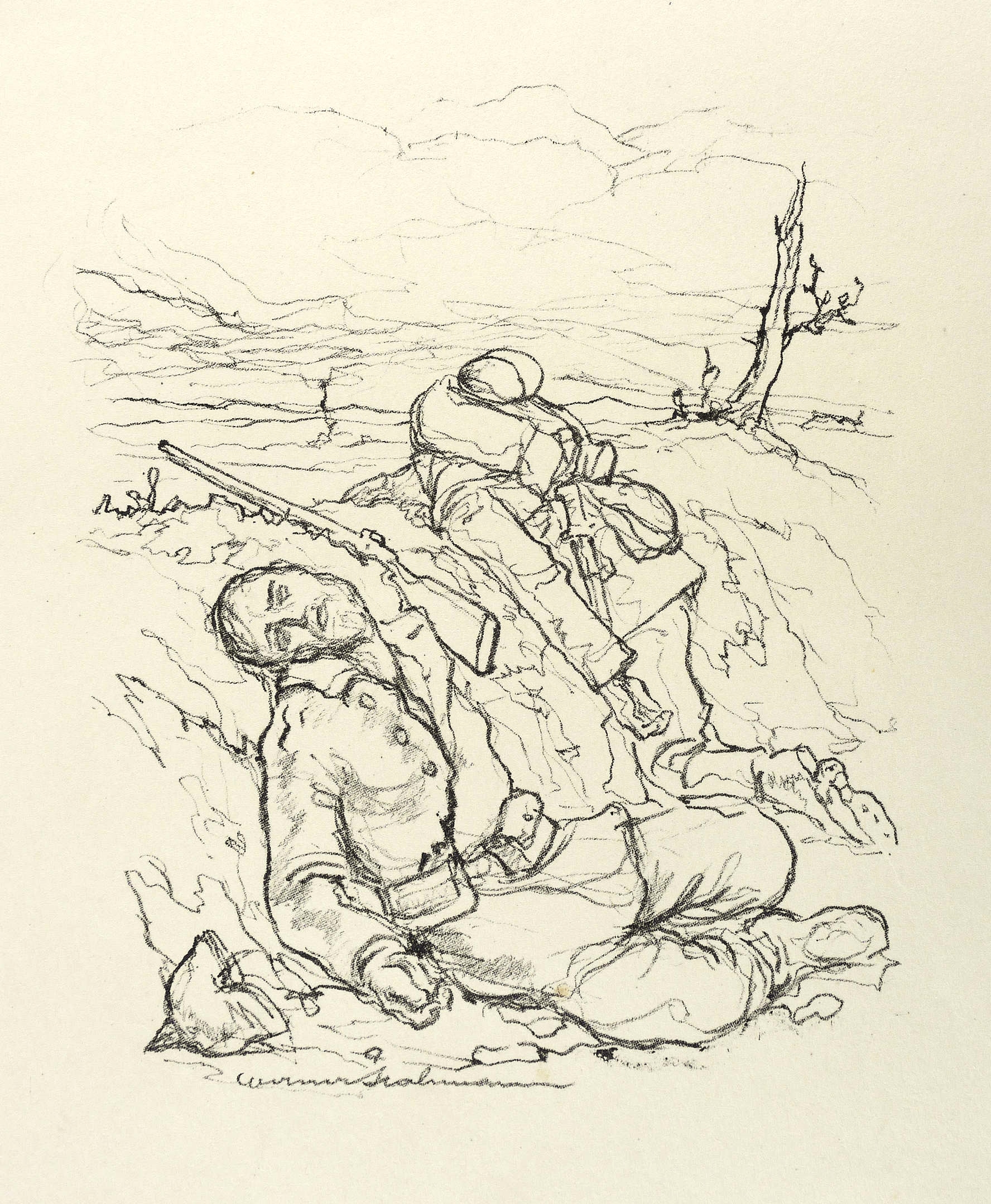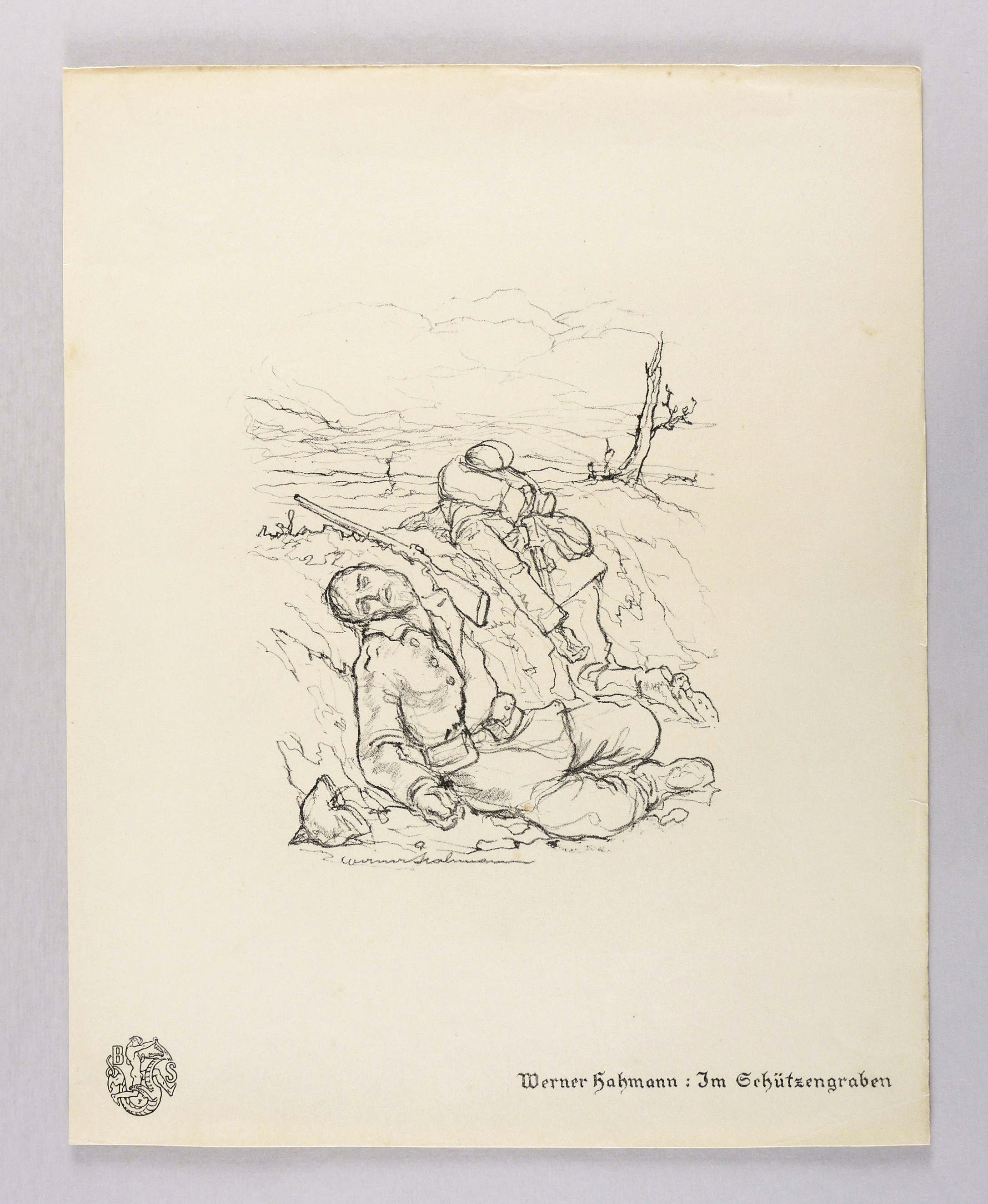Aus: Krieg und Kunst. Original-Steinzeichnungen der Berliner Sezession (Berlin: Julius Bard 1915). – Nicht handsigniert. Im Stein links unten signiert: ″Werner Hahmann″. Am Blattrand rechts unten typografisch bezeichnet ″Werner Hahmann: Im Schützengraben″. Links unten Vignette der Berliner Secession. – Papier etwas gegilbt. Leichte Knickspuren. Kleiner Einriss im rechten Rand. Mäßig guter Zustand.