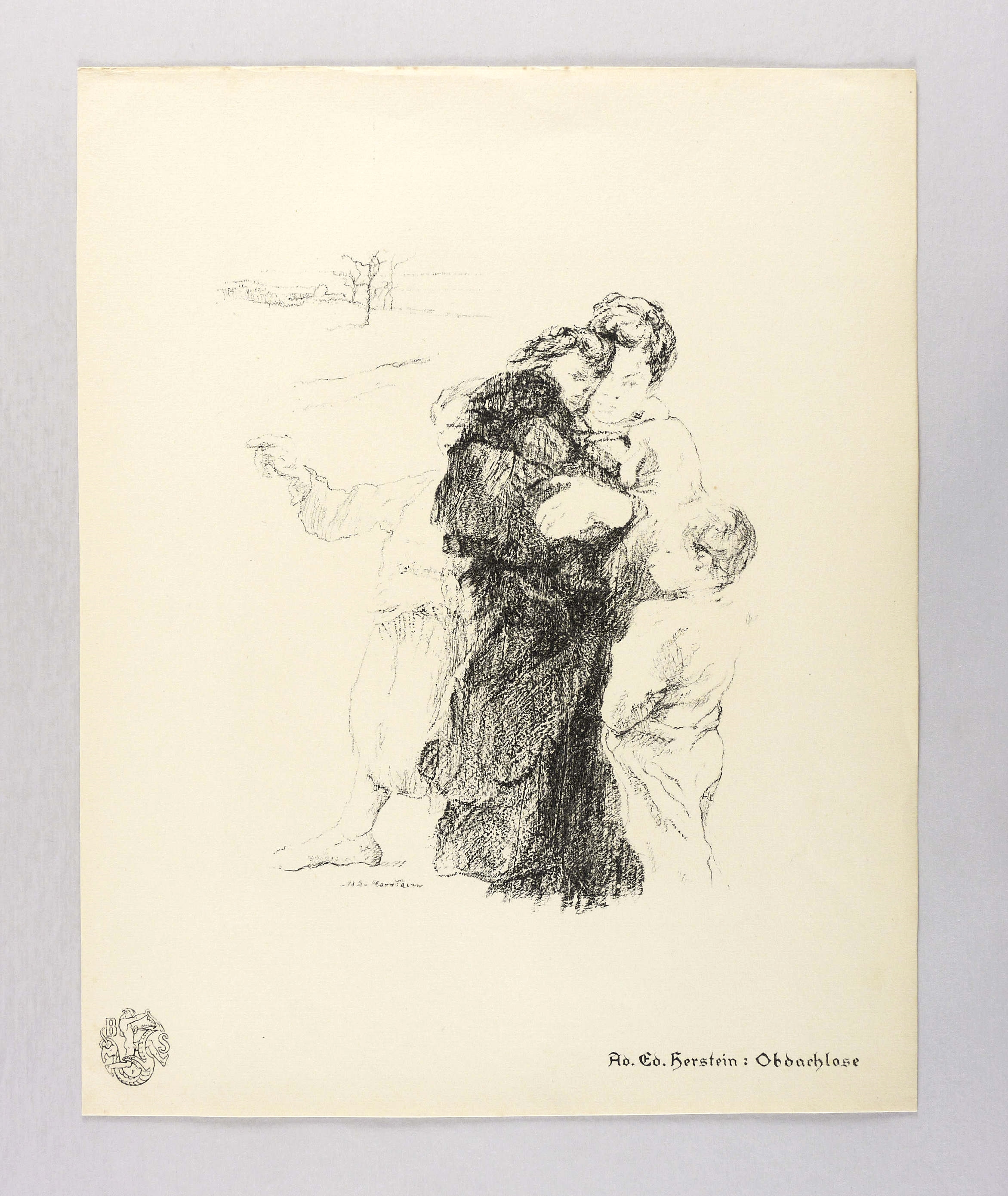 Aus: Krieg und Kunst. Original-Steinzeichnungen der Berliner Sezession (Berlin: Julius Bard 1915). – Nicht handsigniert. Im Stein links unten signiert: ″A.E. Herstein″. Am Blattrand rechts unten typografisch bezeichnet ″Ad. Ad. Herstein: Obdachlose″. Links unten Vignette der Berliner Secession. – Papier etwas gegilbt. Leichte Knickspuren. Guter Zustand.