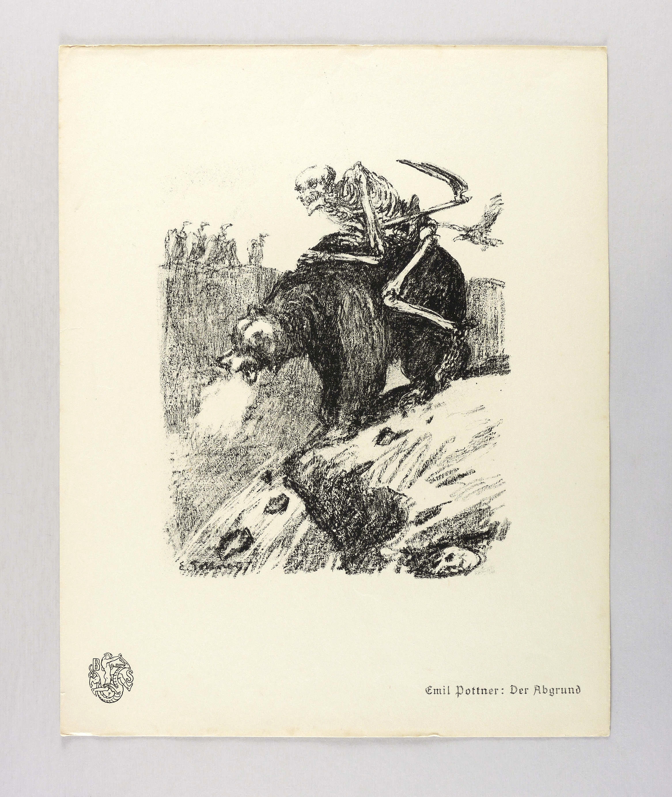 Aus: Krieg und Kunst. Original-Steinzeichnungen der Berliner Sezession (Berlin: Julius Bard 1915). – Nicht handsigniert. Im Stein links unten signiert: ″E. Pottner″. Am Blattrand rechts unten typografisch bezeichnet: ″Emil Pottner: Der Abgrund″. Links unten Vignette der Berliner Secession. – Papier in den Blattkanten minimal gegilbt. Durchgehend leichte Altersspuren. Kaum merklich fleckig. Guter Zustand.