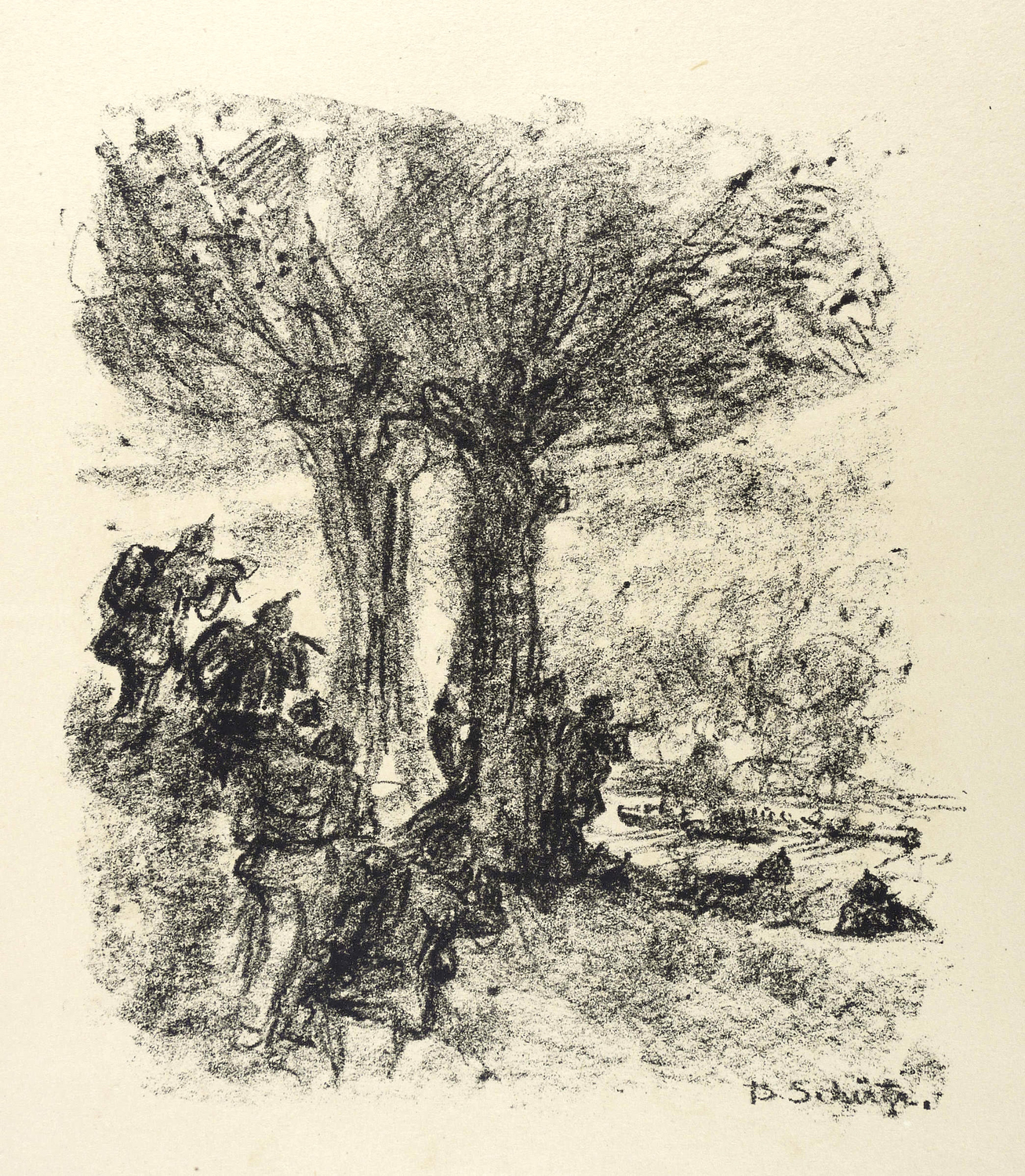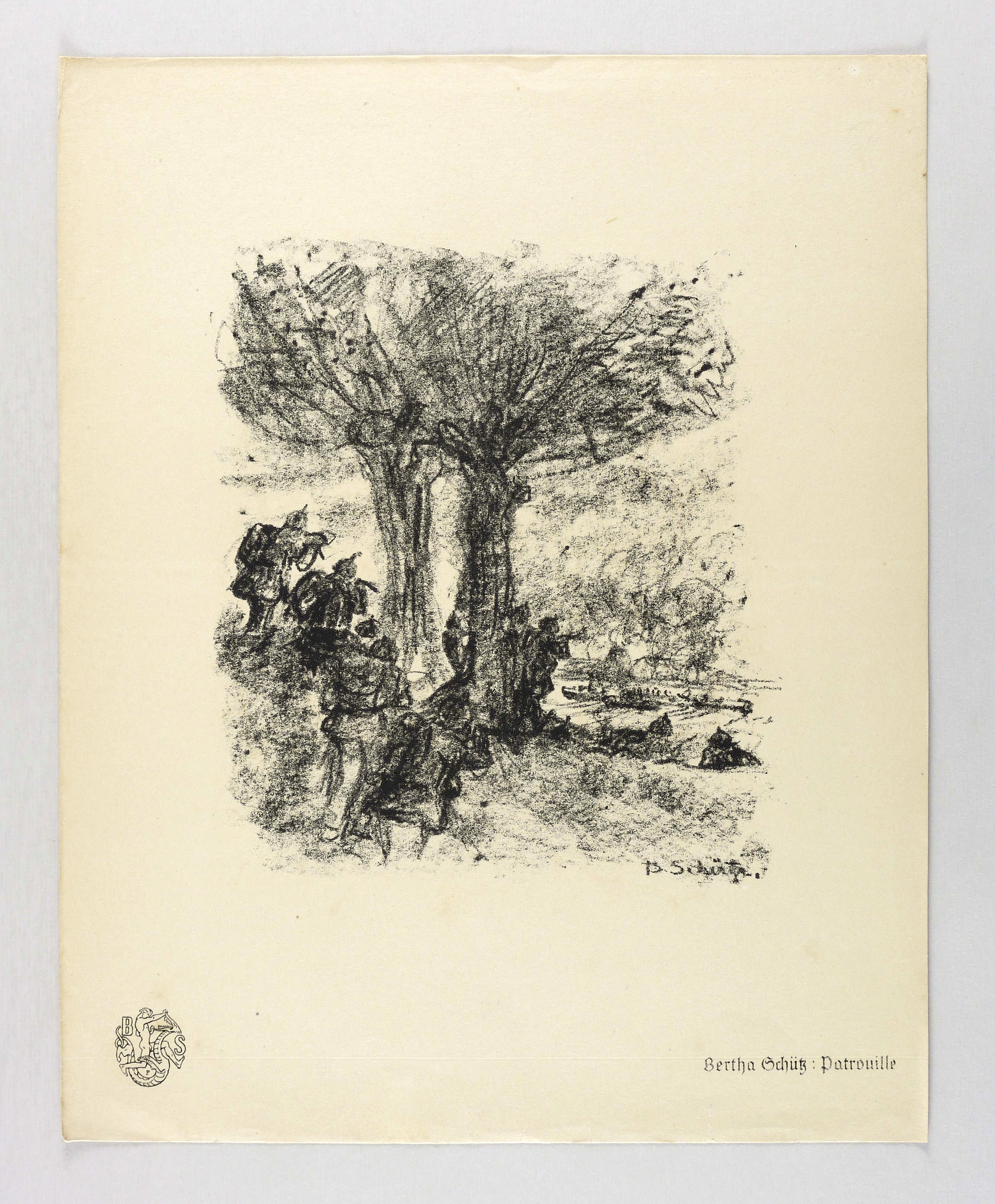 Aus: Krieg und Kunst. Original-Steinzeichnungen der Berliner Sezession (Berlin: Julius Bard 1915). – Nicht handsigniert. Im Stein rechts unten signiert: ″B. Schütz″. Am Blattrand rechts unten typografisch bezeichnet: ″Bertha Schütz: Patrouille″. Links unten Vignette der Berliner Secession. – Papier mit unscheinbaren Altersspuren. Blattränder leicht bestoßen und minimal fleckig. Insgesamt guter Zustand.