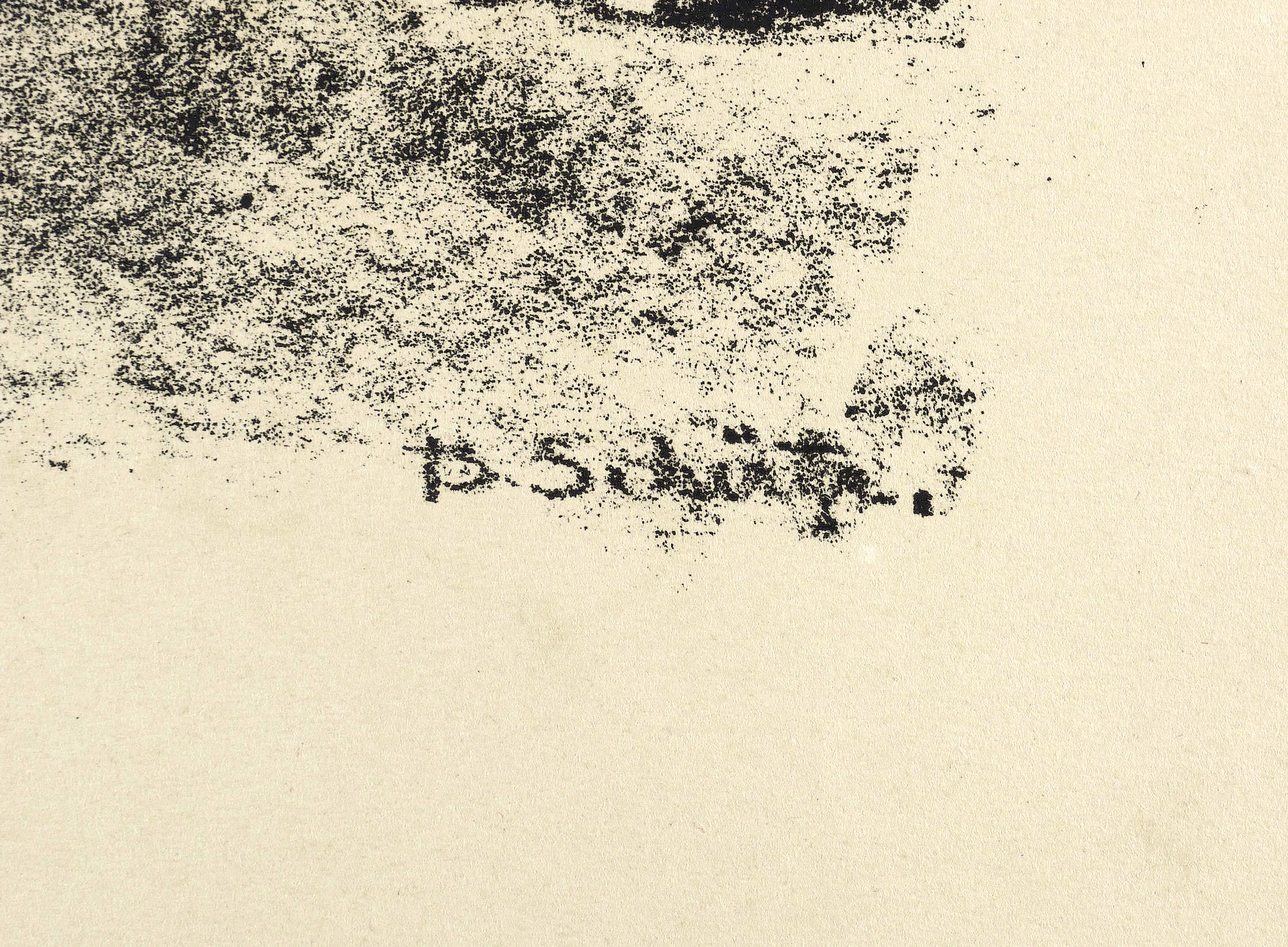 1915. Lithografie / Kreidelithografie, in Schwarz, auf weichem gelblichem Maschinenpapier. – Originale Künstlergrafik, von Bertha Schütz. – 24,8 x 21,9 cm (Darstellung / Druckbild), 42 x 34 cm (Blatt).