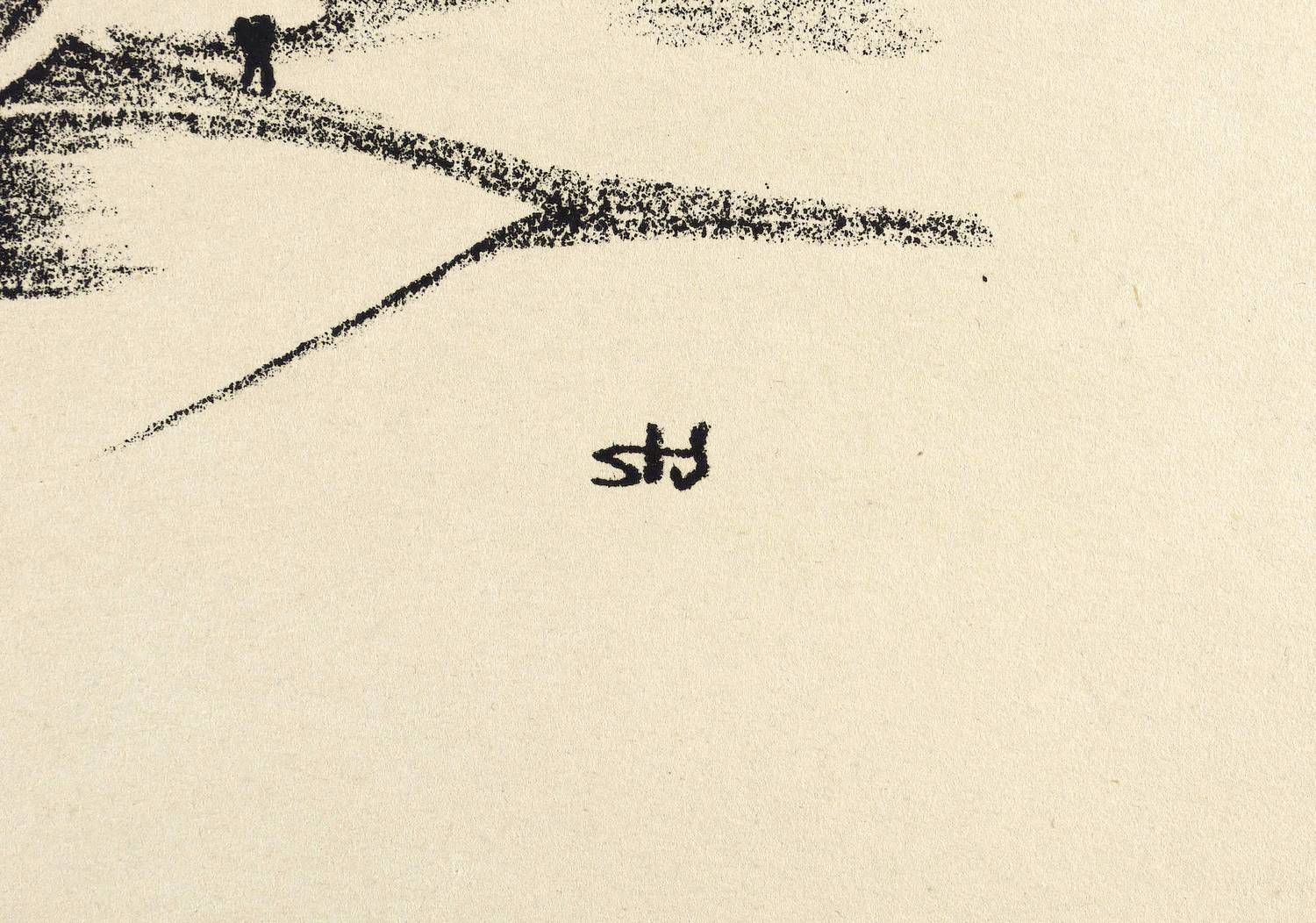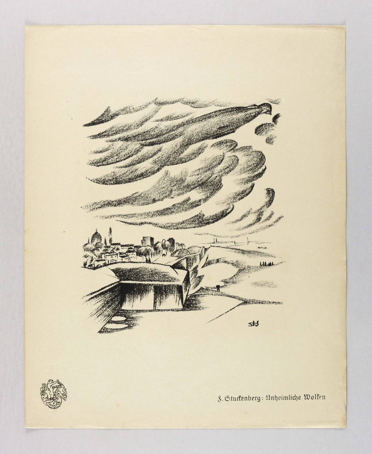 Aus: Krieg und Kunst. Original-Steinzeichnungen der Berliner Sezession (Berlin: Julius Bard 1915). – Nicht handsigniert. Im Steim rechts unten Monogramm: ″Stu″. Im Blattrand rechts unten typografisch bezeichnet: ″F. Stuckenberg: Unheimliche Wolken″. Links unten Vignette der Berliner Secession. – Originalrandiges Exemplar. Blattkanten altersbedingt minimal gegilbt. Guter Zustand.