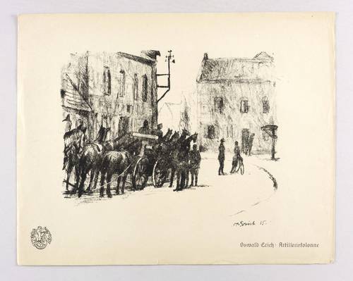 Aus: Krieg und Kunst. Original-Steinzeichnungen der Berliner Sezession (Berlin: Julius Bard 1915). – Nicht handsigniert. Im Stein rechts unten signiert und datiert: ″O.A. Erich 15.″ Im Blattrand rechts unten typografisch bezeichnet: ″Oswald Erich: Artilleriekolonne″. Links unten Vignette der Berliner Secession. – Papier mit leichten Randmängeln. Blattkanten leicht gegilbt, bestoßen und minimal fleckig. Insgesamt mäßig guter Zustand.