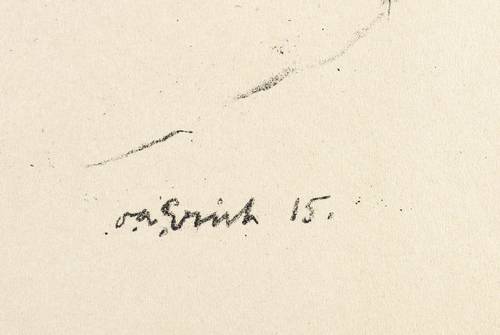 1915. Lithografie / Kreidelithografie, in Schwarz, auf weichem gelblichem Maschinenpapier. – Originale Künstlergrafik, von Oswald Adolf Erich. – 20,7 x 29,0 cm (Darstellung / Druckbild), 34 x 42 cm (Blatt).