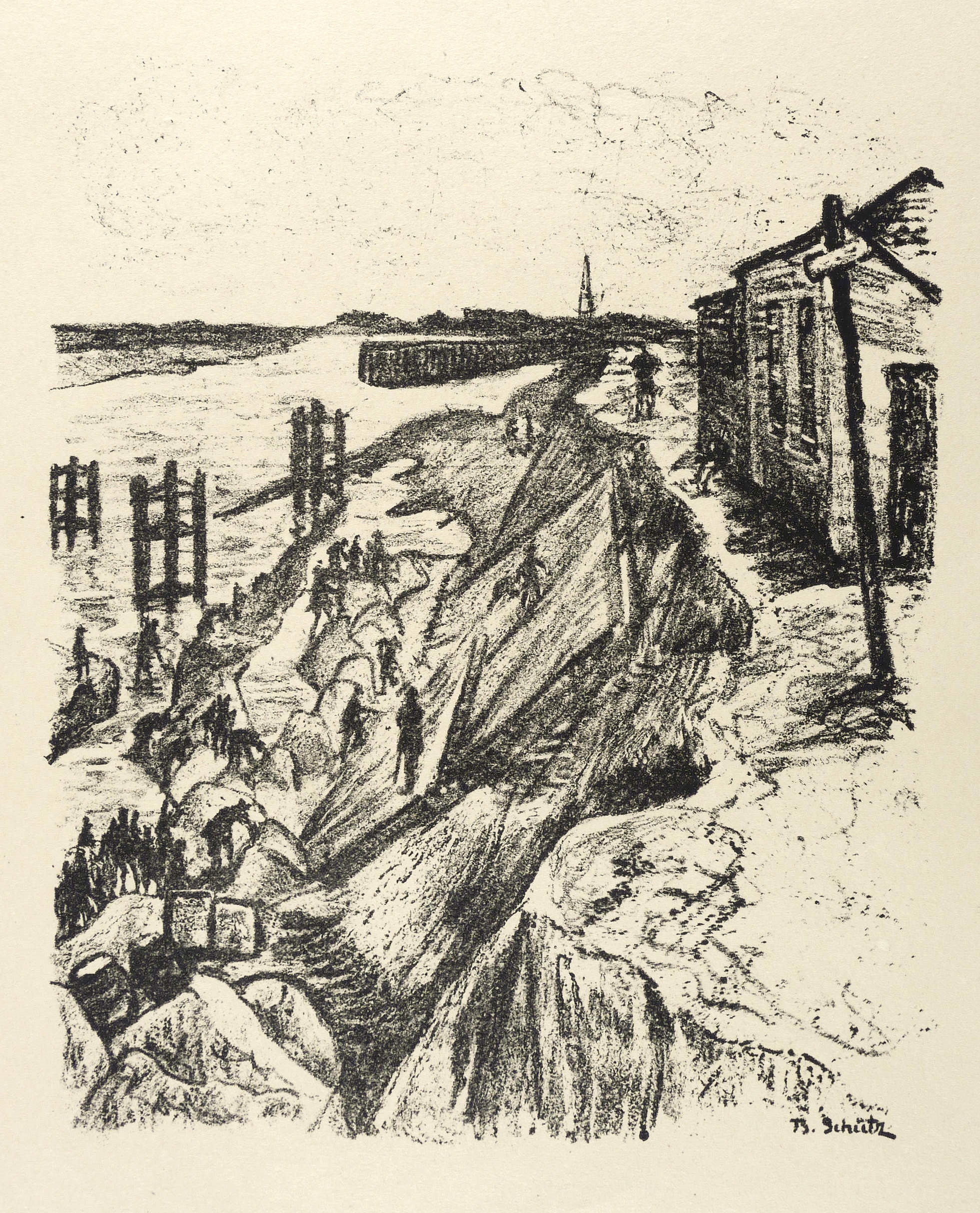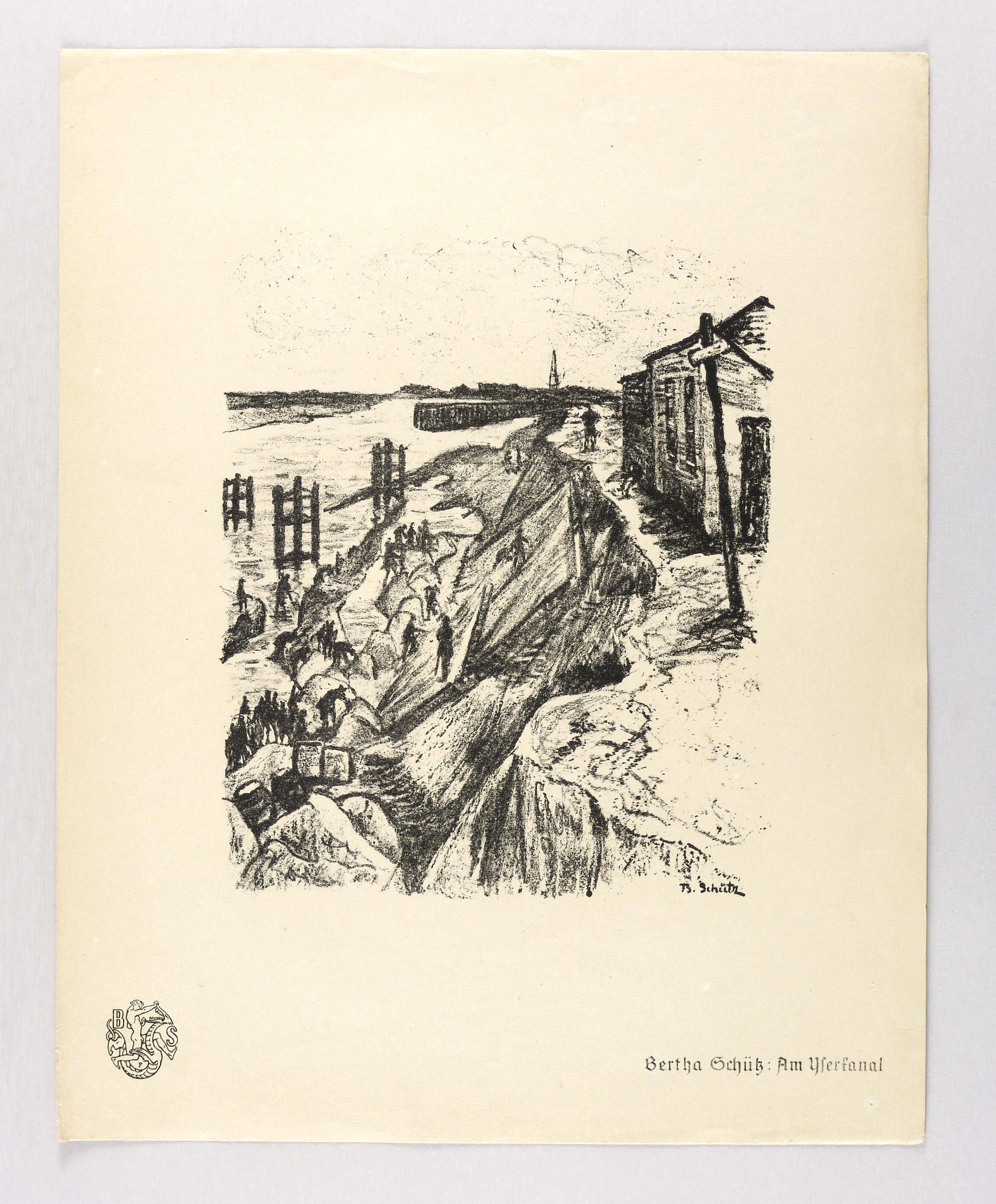 Aus: Krieg und Kunst. Original-Steinzeichnungen der Berliner Sezession (Berlin: Julius Bard 1915). – Nicht handsigniert. Im Stein rechts unten signiert: ″B. Schütz″. Am Blattrand rechts unten typografisch bezeichnet: ″Bertha Schütz: Am Yserkanal″. Links unten Vignette der Berliner Secession. – Papier mit unscheinbaren Altersspuren. Blattränder leicht gegilbt, Ecken etwas bestoßen. Insgesamt aber noch guter Zustand.