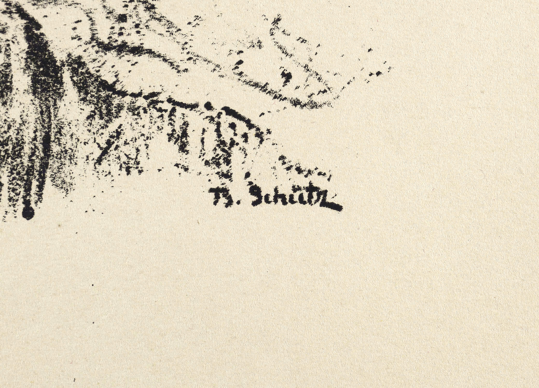 1915. Lithografie / Kreidelithografie, in Schwarz, auf weichem gelblichem Maschinenpapier. – Originale Künstlergrafik, von Bertha Schütz. – 25,4 x 21,1 cm (Darstellung / Druckbild), 42 x 34 cm (Blatt).
