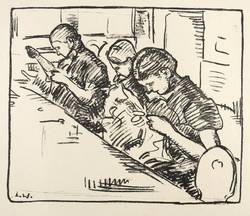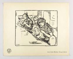Aus: Krieg und Kunst. Original-Steinzeichnungen der Berliner Sezession (Berlin: Julius Bard 1915). – Nicht handsigniert. Im Stein links unten signiert: ″L.W.″. Am Blattrand rechts unten typografisch bezeichnet ″Heinr. Linde-Walther: Kriegsnähstube″. Links unten Vignette der Berliner Secession. – Die Blattecken minimal bestoßen, in den Rändern etwas gegilbt. Insgesamt guter Zustand.