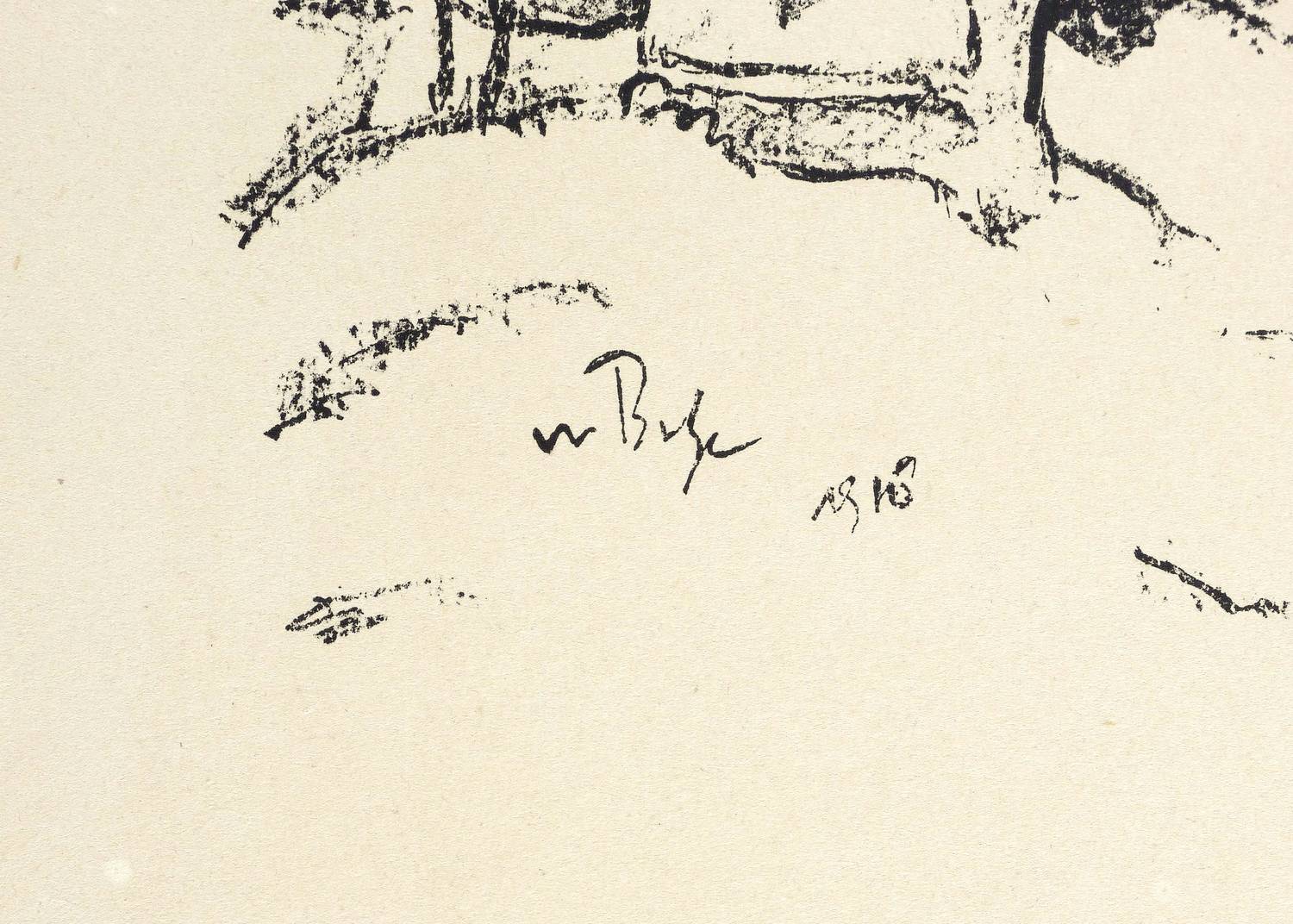 Aus: Krieg und Kunst. Original-Steinzeichnungen der Berliner Sezession (Berlin: Julius Bard 1916). – Nicht handsigniert. Im Stein links unten signiert und datiert: ″W Buhe 1916″. Im Blattrand rechts unten typografisch bezeichnet: ″Walter Buhe: Wilnaer Judenfriedhof″. Links unten Vignette der Berliner Secession. – Originalrandiges Exemplar. Leichte Randmängel, Blattkanten knickspurig und bestoßen, winziger Materialverlust der rechten unteren Ecke, winziges Löchlein im unteren Rand links. Papier altersbedingt etwas gegilbt. Mäßig guter Zustand.