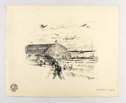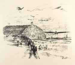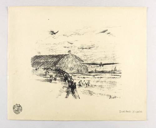 Aus: Krieg und Kunst. Original-Steinzeichnungen der Berliner Sezession (Berlin: Julius Bard 1915-1918). – Nicht handsigniert. Im Stein rechts unten signiert: ″Paul Bach″. Am Blattrand rechts unten typografisch bezeichnet: ″Paul Bach: Flugplatz″. Links unten Vignette der Berliner Secession. – Papier mit unscheinbaren Altersspuren. Blattränder minimal knickspurig, gegilbt und bestoßen. Insgesamt aber noch guter Zustand.