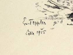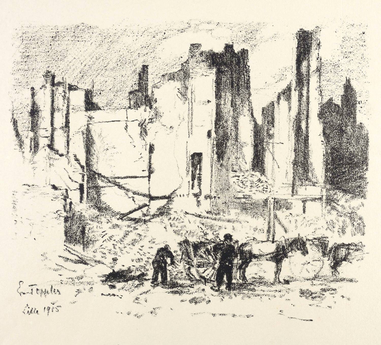 Aus: Krieg und Kunst. Original-Steinzeichnungen der Berliner Sezession (Berlin: Julius Bard 1915). – Nicht handsigniert. Im Stein links unten signiert und datiert: ″E. Oppler / Lille 1915″. Im Blattrand rechts unten typografisch bezeichnet: ″Ernst Oppler: Lille″. Links unten Vignette der Berliner Secession. – Originalrandiges Exemplar. Leichte Randmängel, Blattkanten geringfügig knickspurig. Papier altersbedingt leicht gegilbt. Guter Zustand.