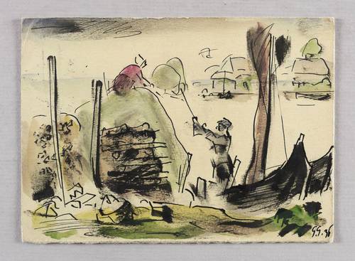 Rechts unten in schwarzer Feder signiert und datiert: ″G.G. 36″. Verso Schreiben an den Vetter Dr. Karl Gelbke in Leipzig: ″Lieber Karl! Vielen Dank für Dein tatkräftiges Gedenken. Es ist hochwillkommen. Wir sitzen bei sehr (..vollem?) aber erlebnisreichem Wetter in Rossitten. Es wird nicht ohne Erfolg aqu. (...?) namentlich Dünen habe ich neu studiert udn schöne Abendstücke gemacht. Sehr viel schöne Wolken-Studien. Wir ziehen Mitte Sept. ins nächste Dorf, Pillkoppen, wo es noch Fischer gibt. (...)″. Poststempel vom 26.9.1936. – Fischer bringen Heu vom Festland zur Nehrung. – Vorzügliche Erhaltung. Ohne Mängel. Sehr guter Zustand.
