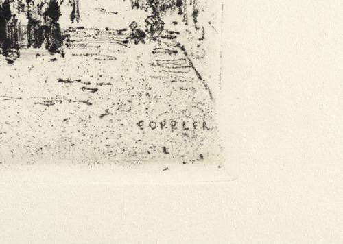 1913. Radierung / Vernis mou, in Schwarz, auf gelbem Velinkarton. – Originale Künstlergrafik, von Ernst Oppler. – 17,7 x 23,8 cm (Darstellung / Druckbild), 24 x 33 cm (Blatt), 18,5 x 24,8 cm (Platte).